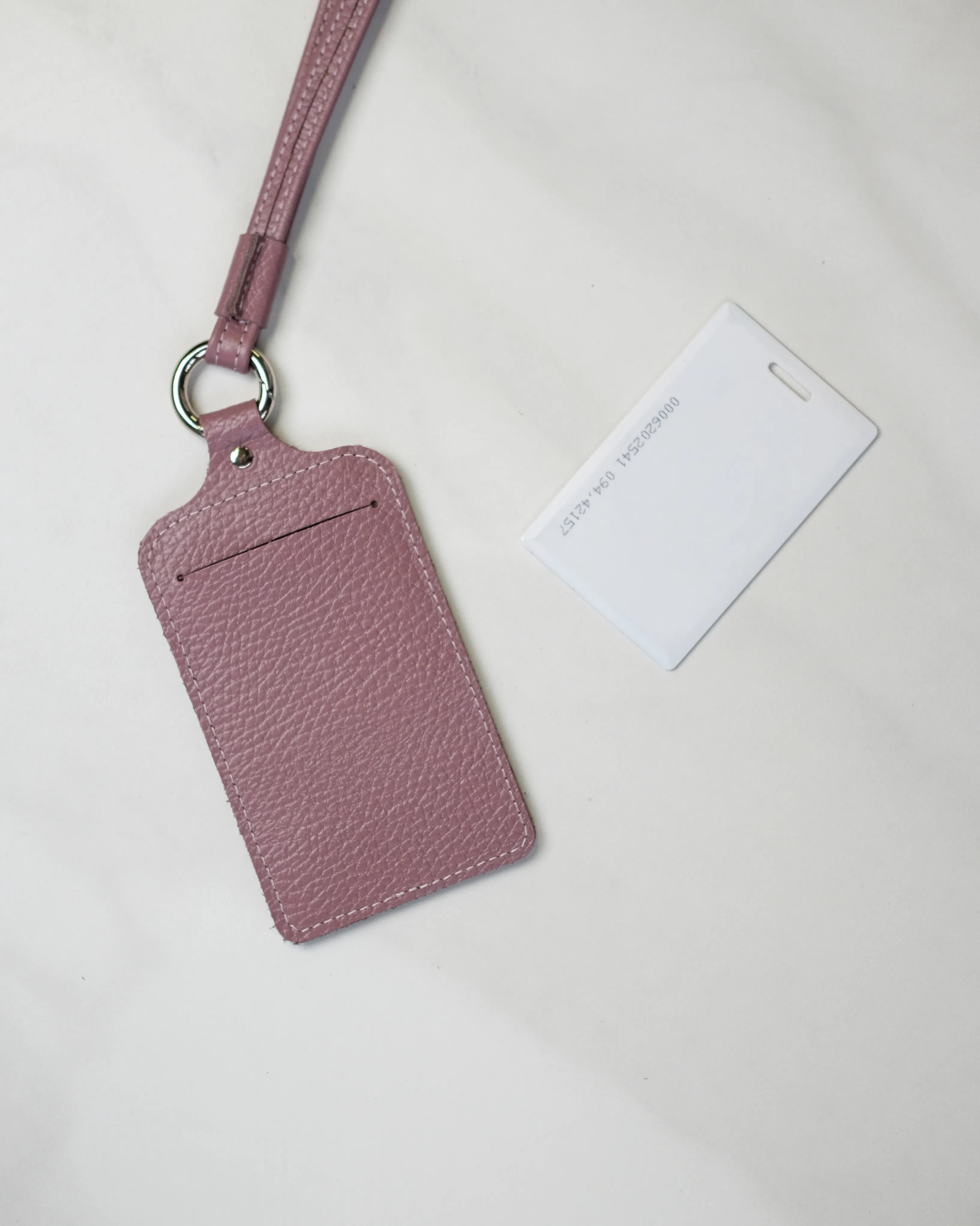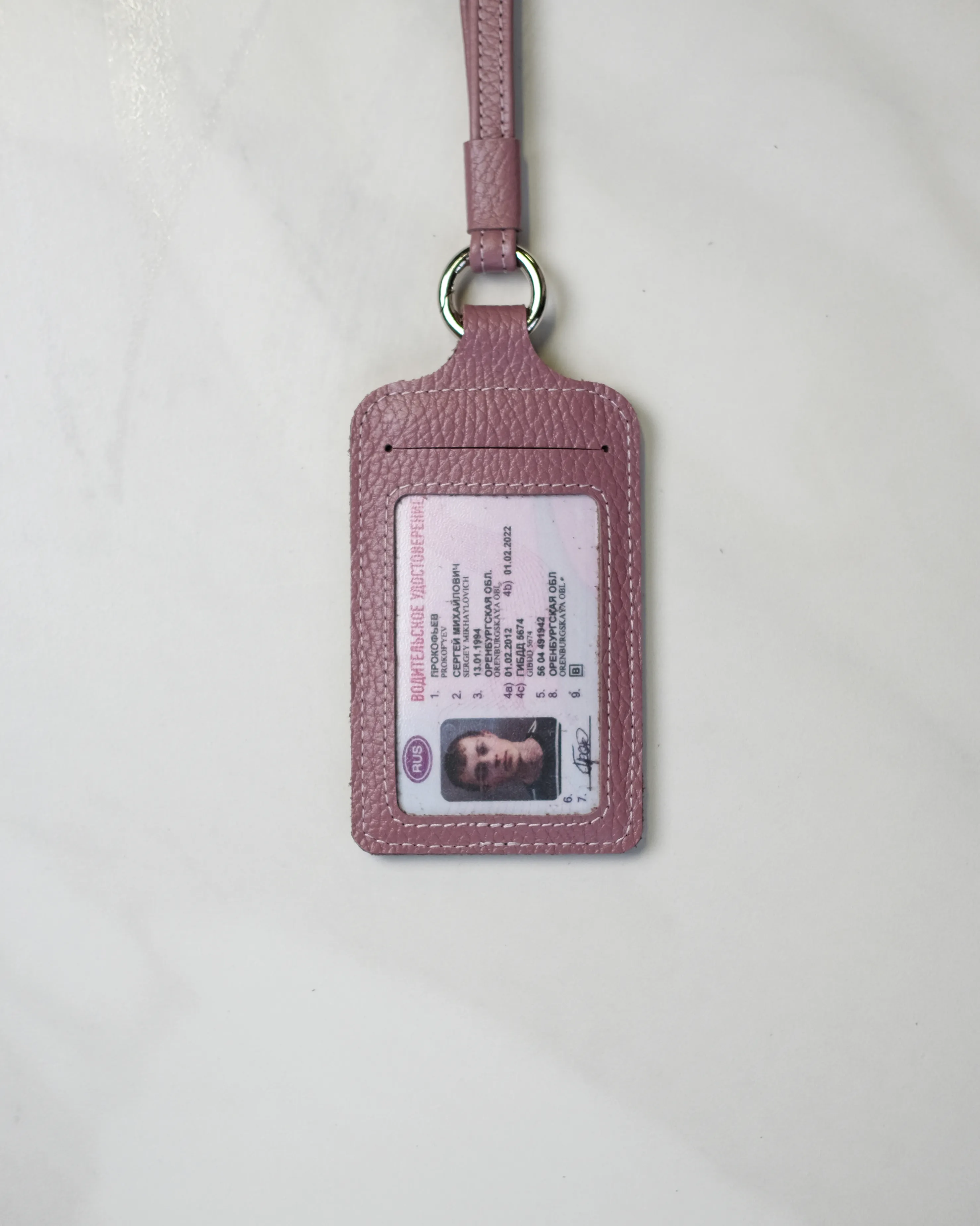 Чехол для пропуска с прозрачным окошком и съёмным ремешком. Выполнен из натуральной кожи с выраженной зернистой фактурой. Благодаря кольцу-карабину ремешок легко отстёгивается, а сам чехол можно закрепить на джинсах или рюкзаке. Длина ремешка в сложенном виде составляет 50 см. Подходит для хранения пропуска и использования в качестве бейджа на выставках, конференциях и других мероприятиях.