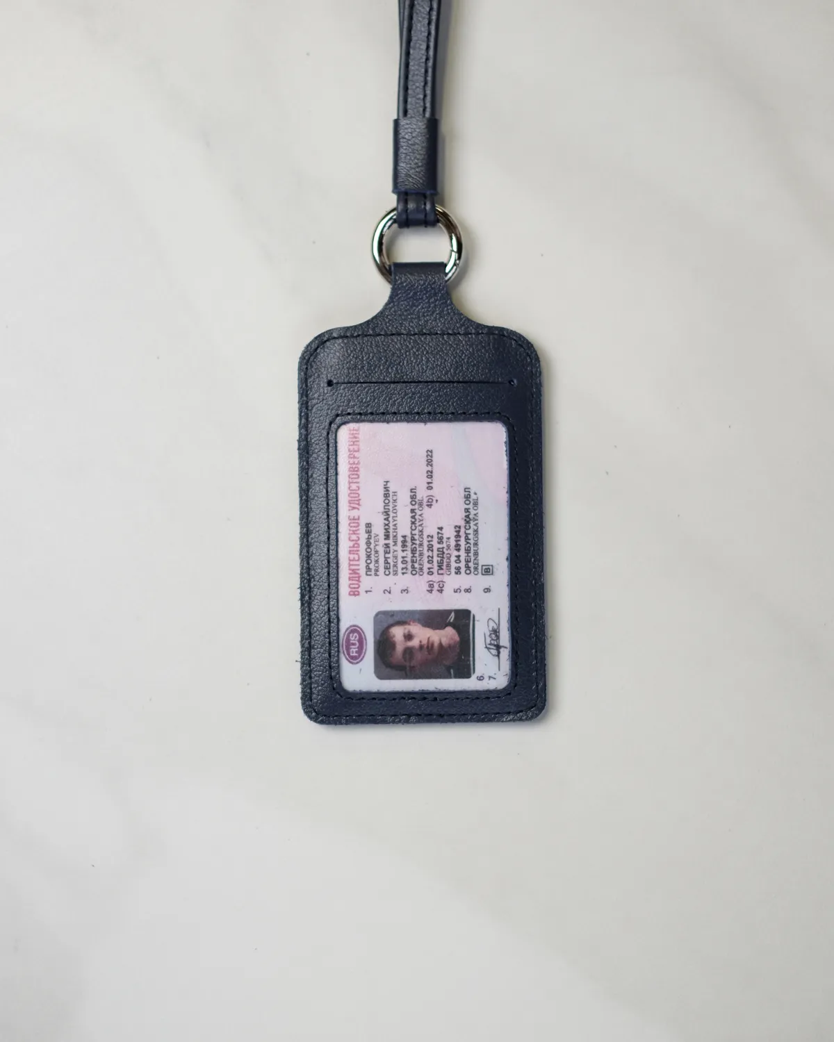 Чехол для пропуска с прозрачным окошком и съёмным ремешком. Выполнен из натуральной гладкой кожи. Благодаря кольцу-карабину ремешок легко отстёгивается, а сам чехол можно закрепить на джинсах или рюкзаке. Длина ремешка в сложенном виде составляет 50 см. Подходит для хранения пропуска и использования в качестве бейджа на выставках, конференциях и других мероприятиях.