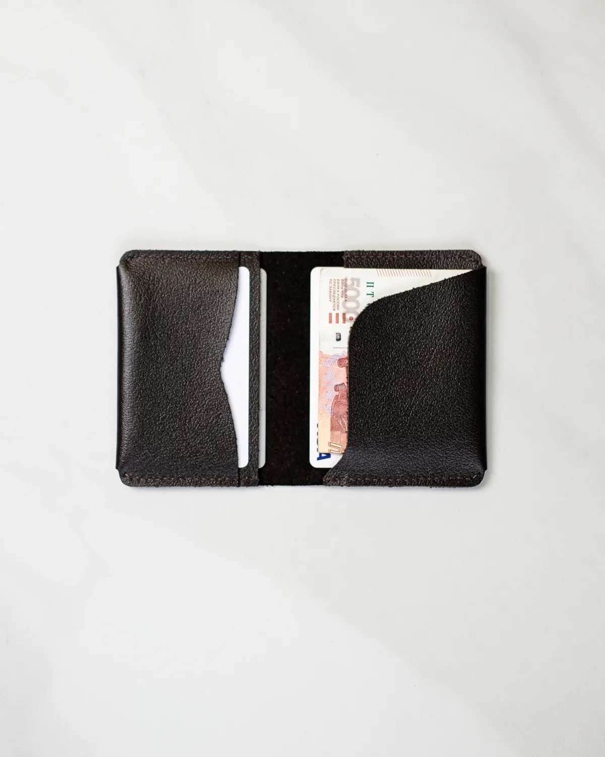 Картхолдер-книжка из натуральной гладкой кожи с 4 кармашками для пластиковых карт и купюр, сложенных вдвое. Плоский и компактный, благодаря отсутствию застежек, магнитов и другой фурнитуры.