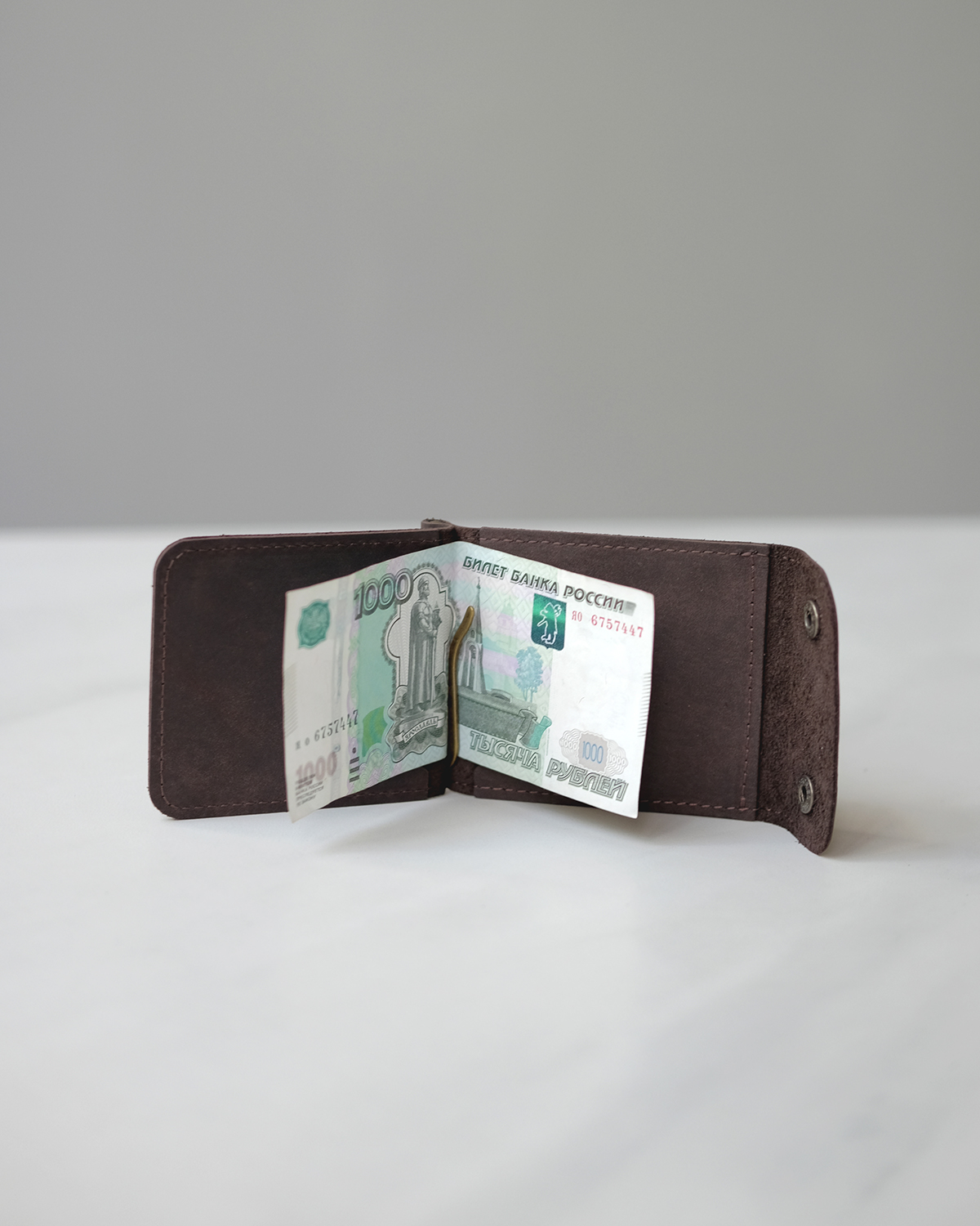 Кожаный зажим для купюр с металлическим фиксирующим механизмом. Внутри два кармашка для пластиковых карт.