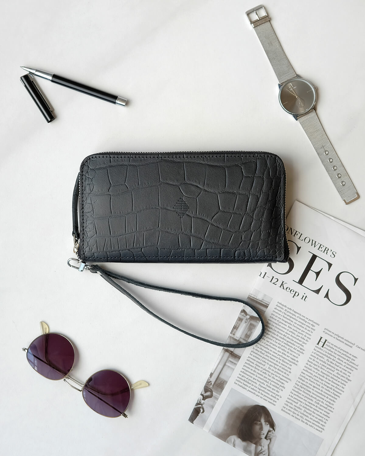 Кошелёк на молнии из плотной кожи. Есть съёмный ремешок, чтобы носить на запястье. Внутри основное отделение с ограничителями, поместятся телефон и паспорт. По бокам карман для купюр и 6 кармашков для карт. Снаружи карман на молнии для монет.