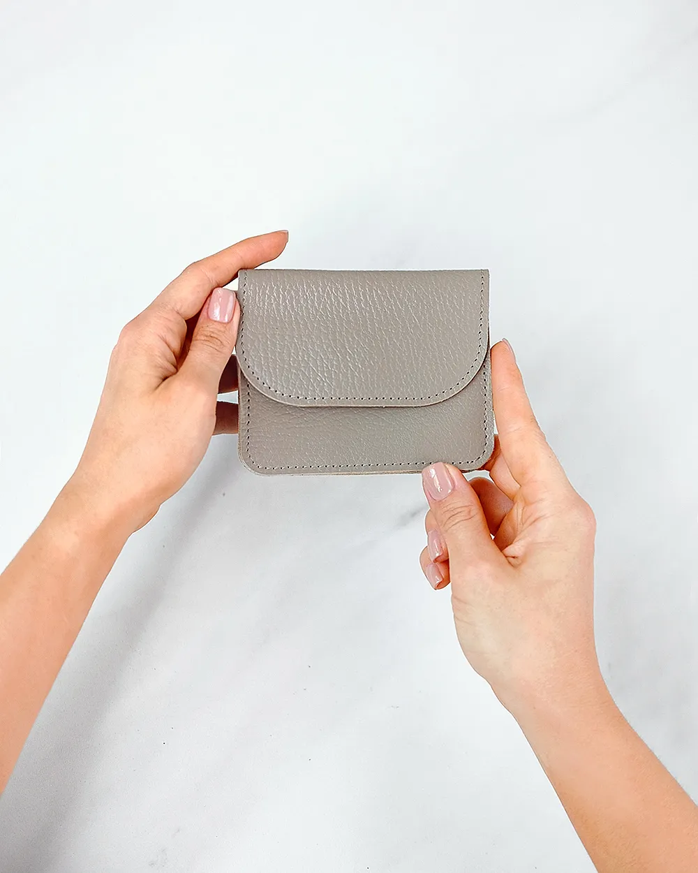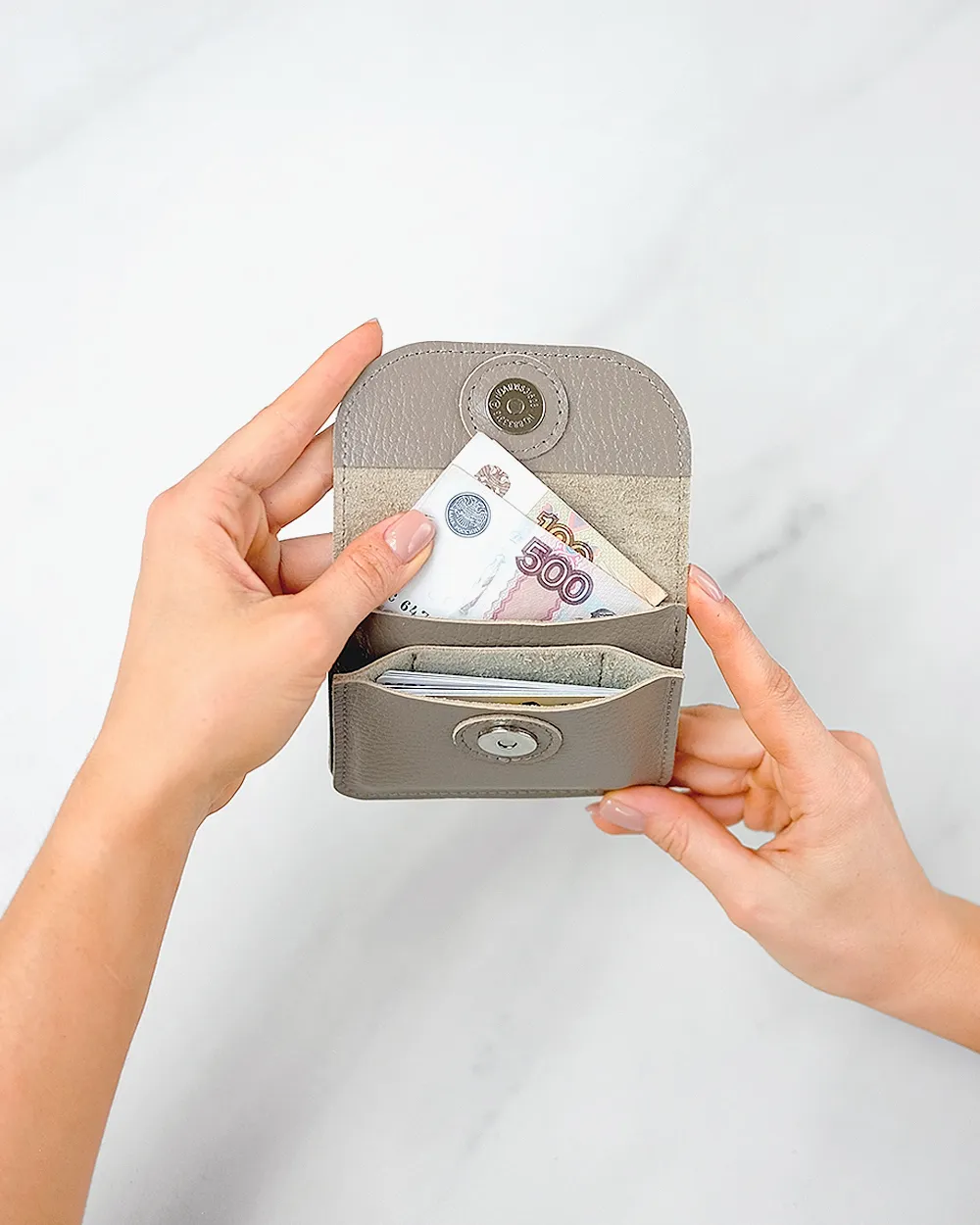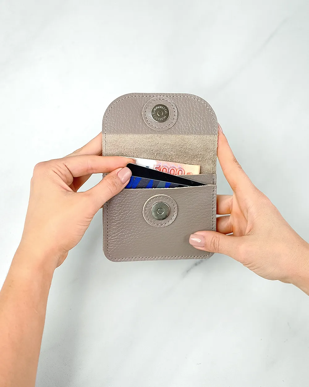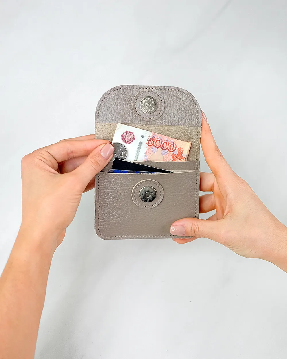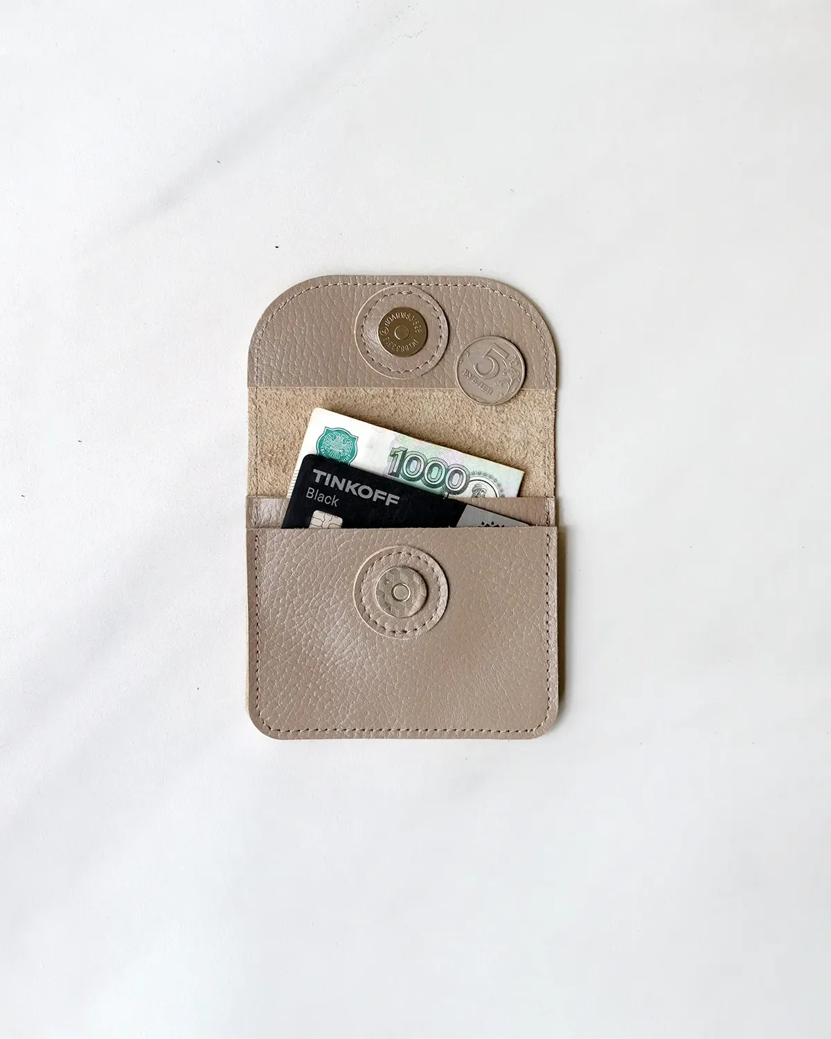 Компактный кожаный кошелёк-конверт с клапаном на магнитной кнопке. Вмещает купюры, сложенные вдвое, карты, монеты. Два отделения, есть запас места под стопку карт около 1 см.