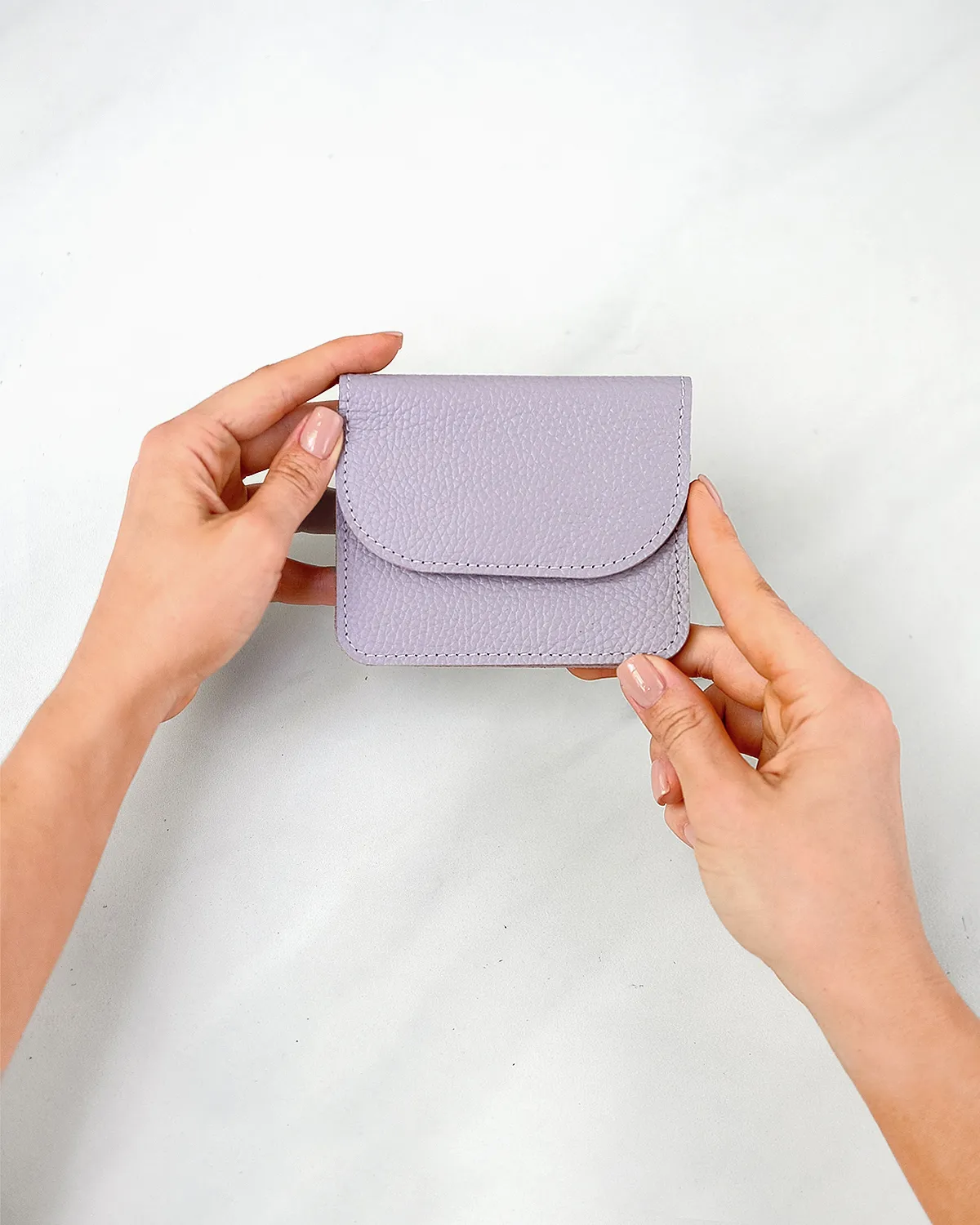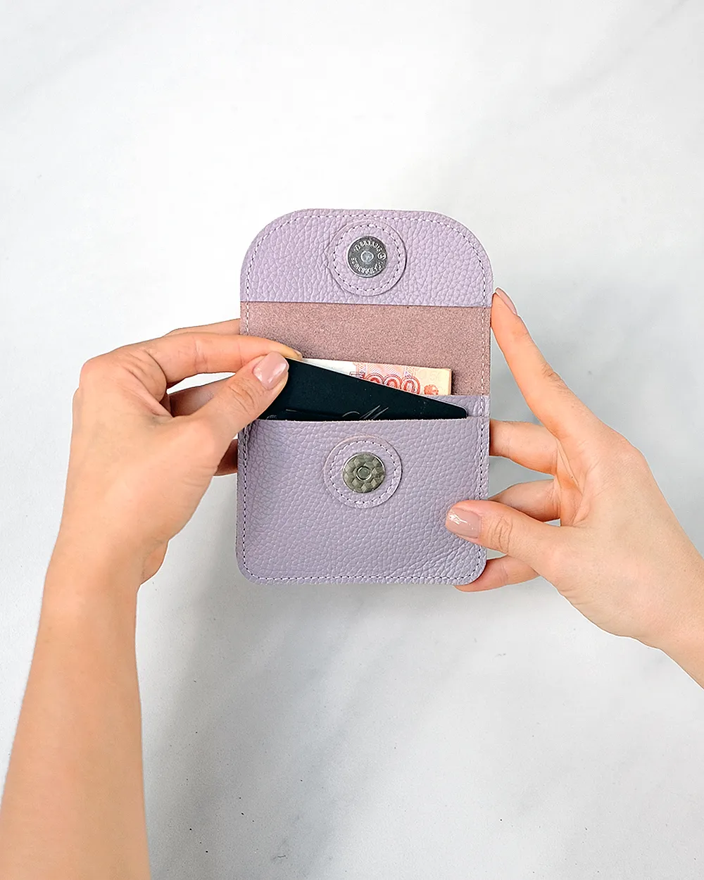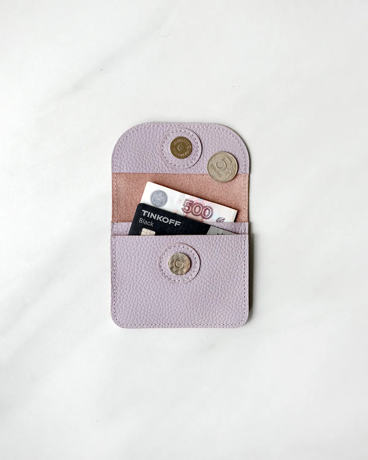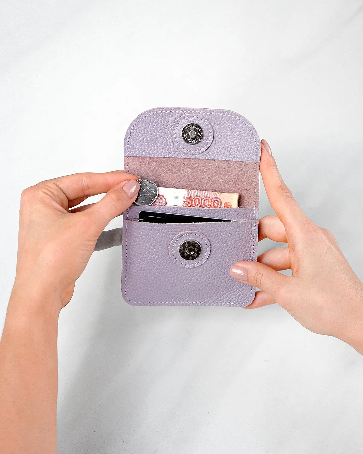 Компактный кожаный кошелёк-конверт с клапаном на магнитной кнопке. Вмещает купюры, сложенные вдвое, карты, монеты. Два отделения, есть запас места под стопку карт около 1 см.