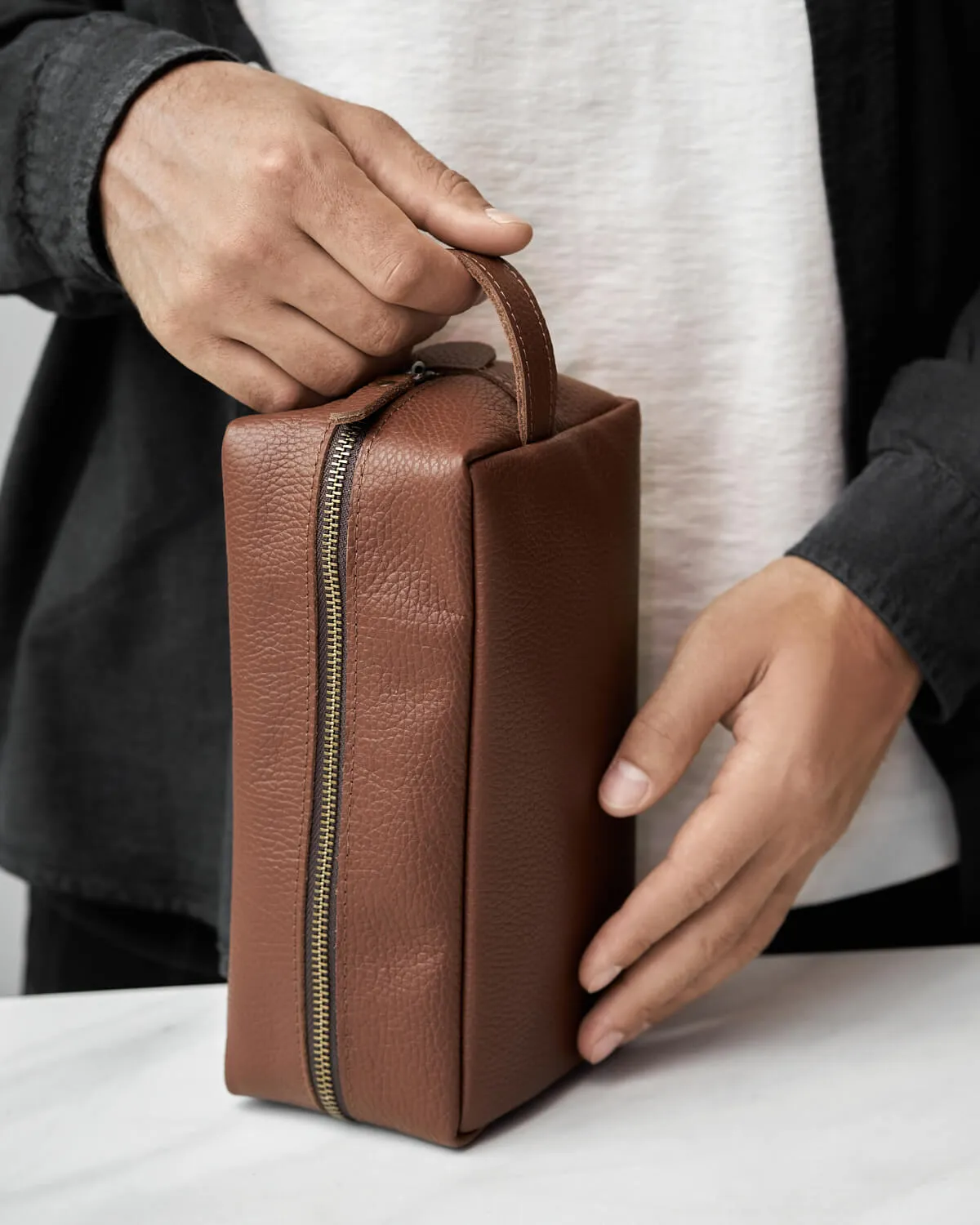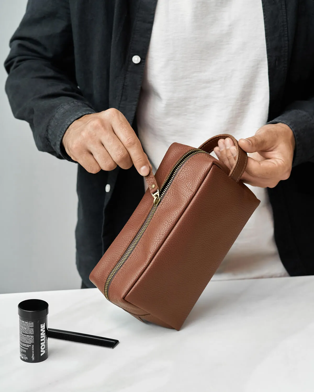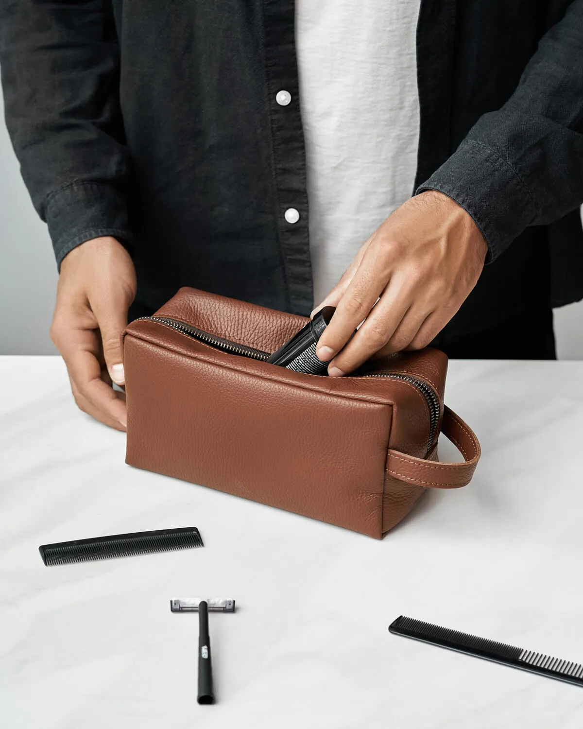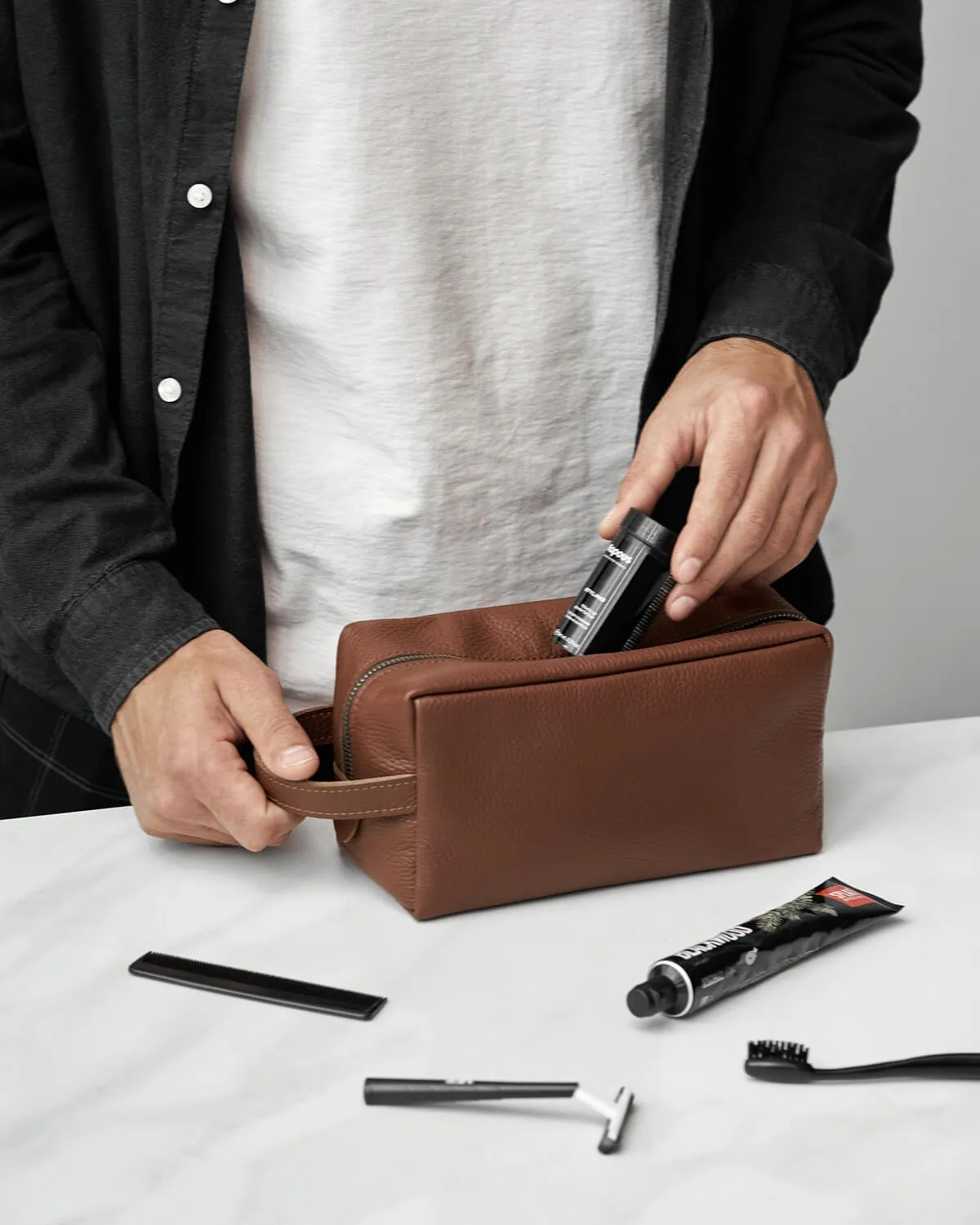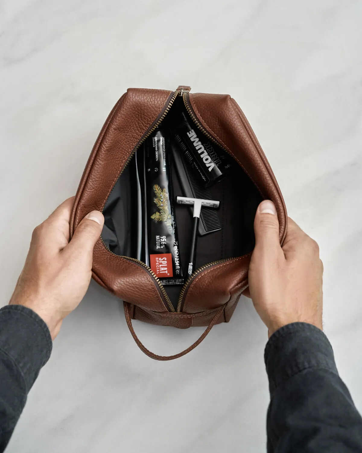 Кожаный несессер подойдет для поездок, походов в бассейн, спортзал или просто для хранения косметики. Изготовлен из мягкой эластичной натуральной кожи, внутри черная тканевая подкладка. Одно основное отделение вмещает косметические средства среднего или дорожного объема — шампунь, гель для душа, зубную пасту и щетку, расческу, кремы, влажные салфетки и другие повседневные вещи.