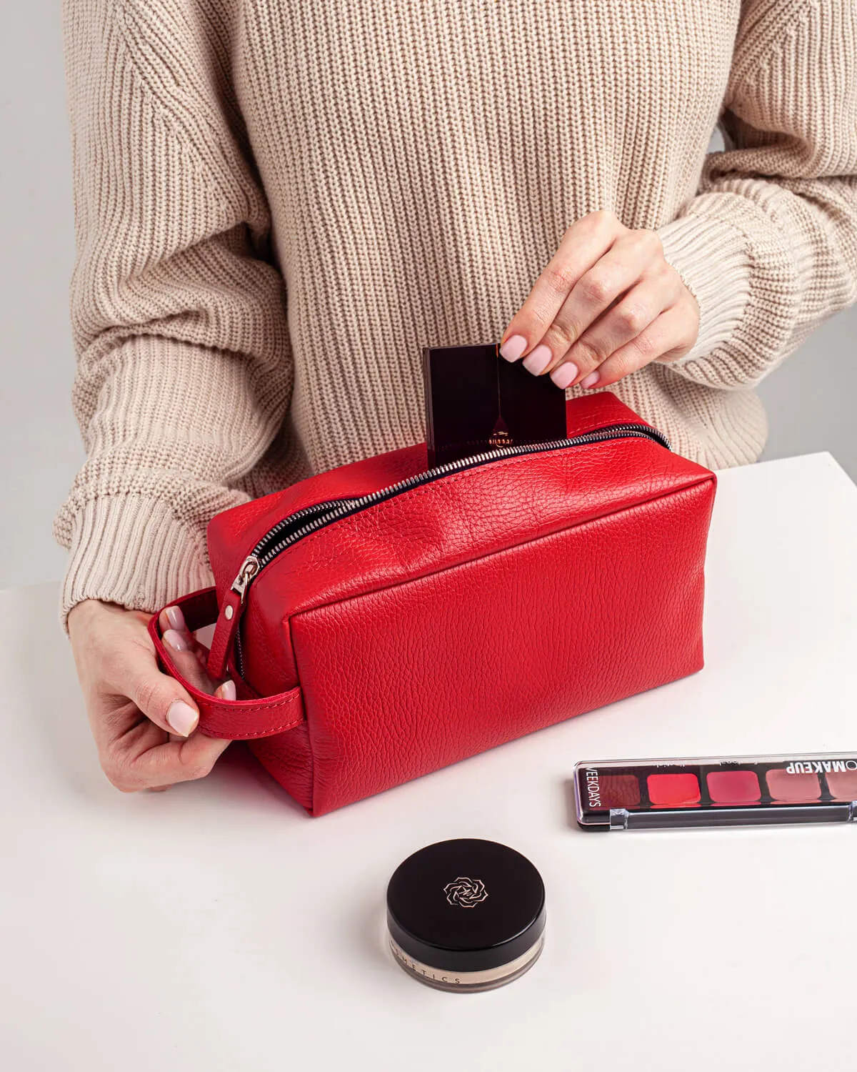 Кожаный несессер подойдет для поездок, походов в бассейн, спортзал или просто для хранения косметики. Изготовлен из мягкой эластичной натуральной кожи, внутри черная тканевая подкладка. Одно основное отделение вмещает косметические средства среднего или дорожного объема — шампунь, гель для душа, зубную пасту и щетку, расческу, кремы, влажные салфетки и другие повседневные вещи.