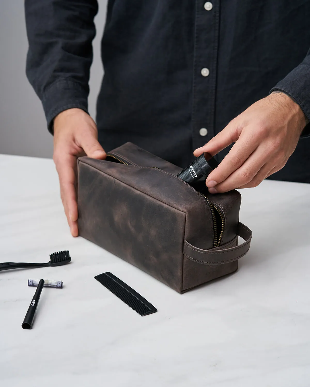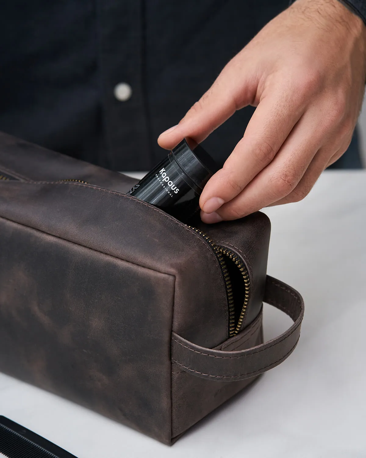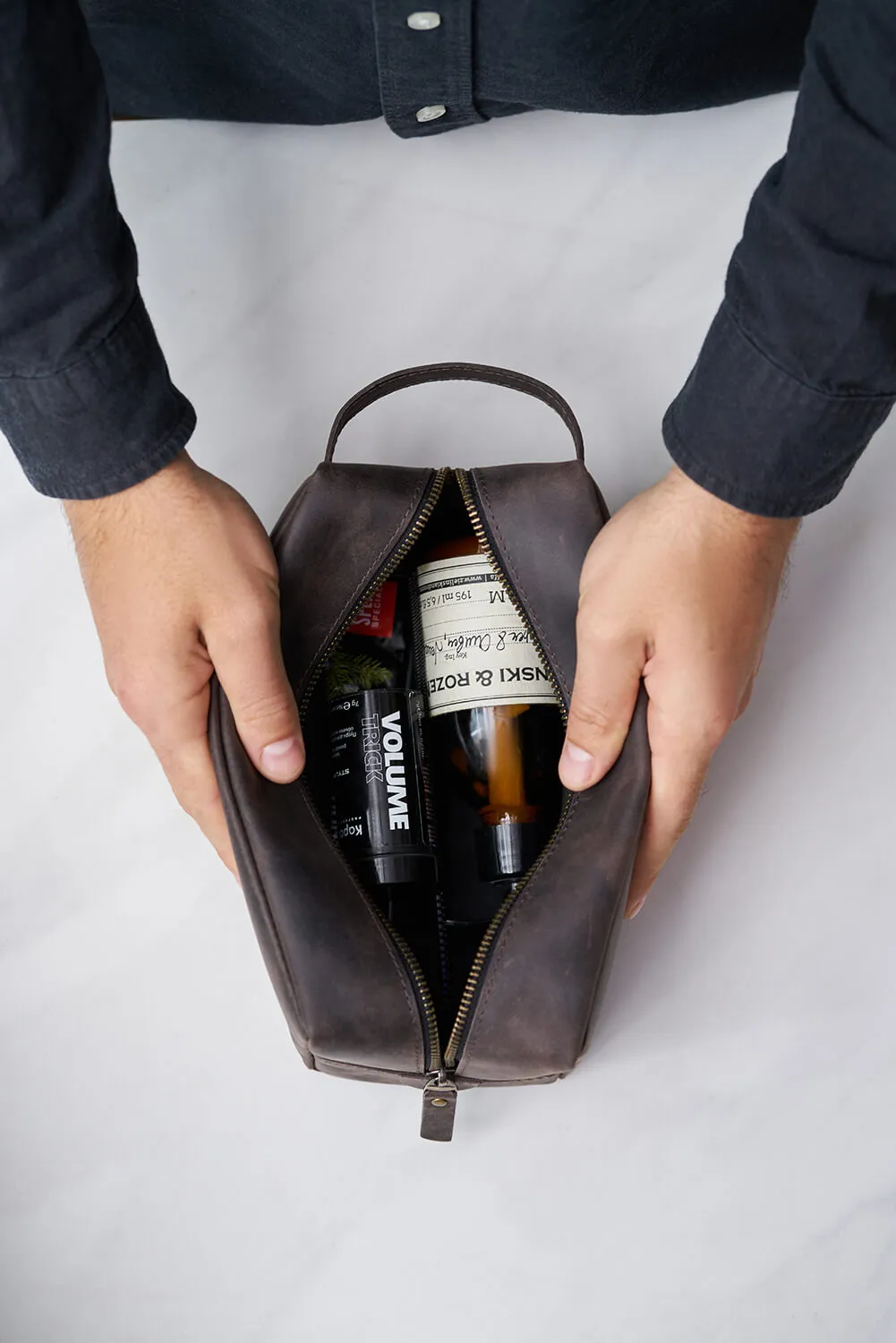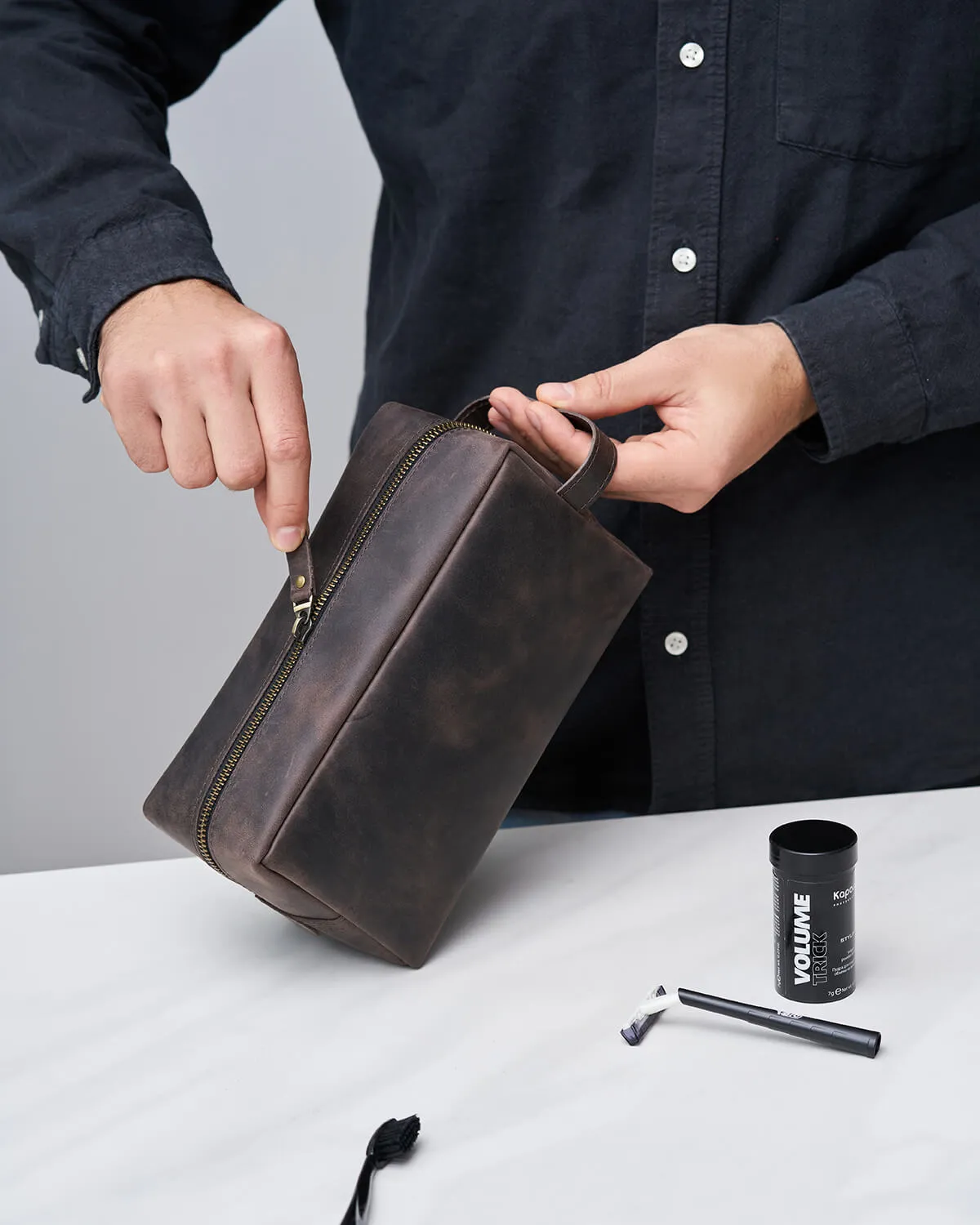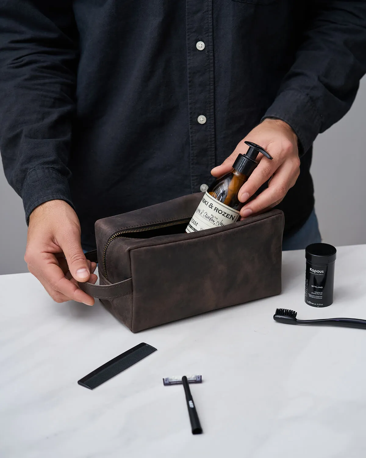 Кожаный несессер подойдет для поездок, походов в бассейн, спортзал или просто для хранения косметики. Изготовлен из мягкой эластичной натуральной кожи, внутри черная тканевая подкладка. Одно основное отделение вмещает косметические средства среднего или дорожного объема — шампунь, гель для душа, зубную пасту и щетку, расческу, кремы, влажные салфетки и другие повседневные вещи.