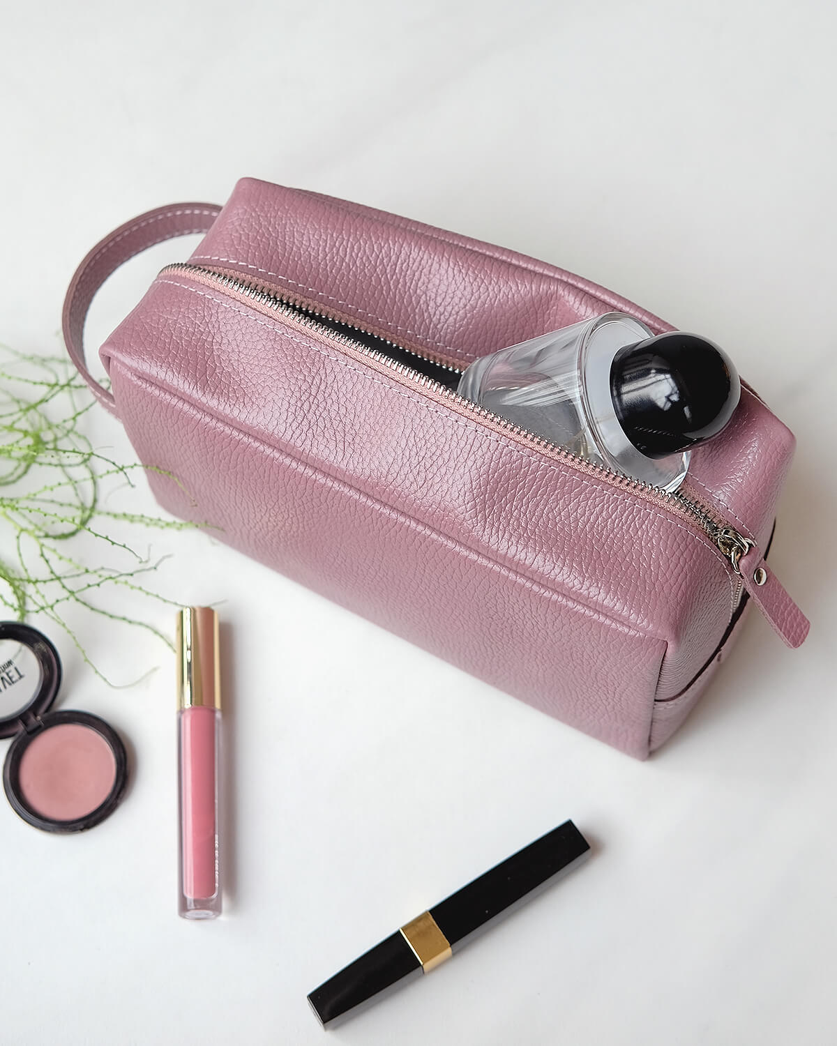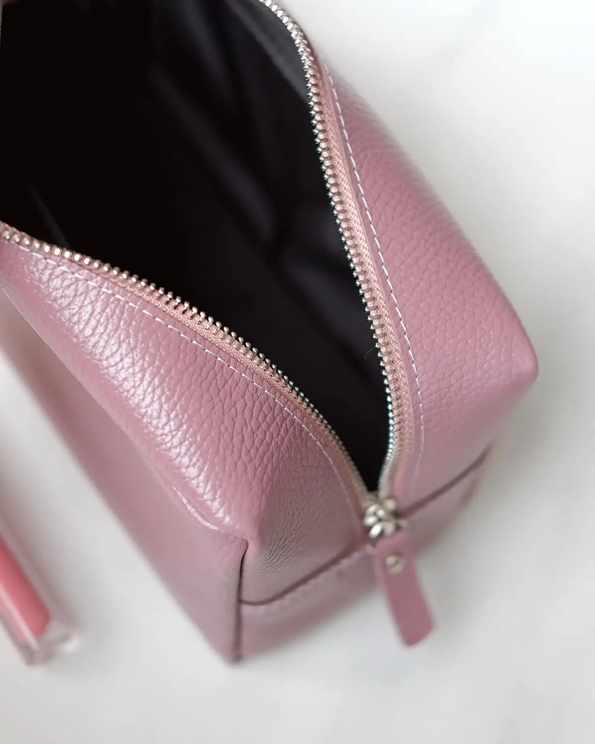 Кожаный несессер подойдет для поездок, походов в бассейн, спортзал или просто для хранения косметики. Изготовлен из мягкой эластичной натуральной кожи, внутри черная тканевая подкладка. Одно основное отделение вмещает косметические средства среднего или дорожного объема — шампунь, гель для душа, зубную пасту и щетку, расческу, кремы, влажные салфетки и другие повседневные вещи.