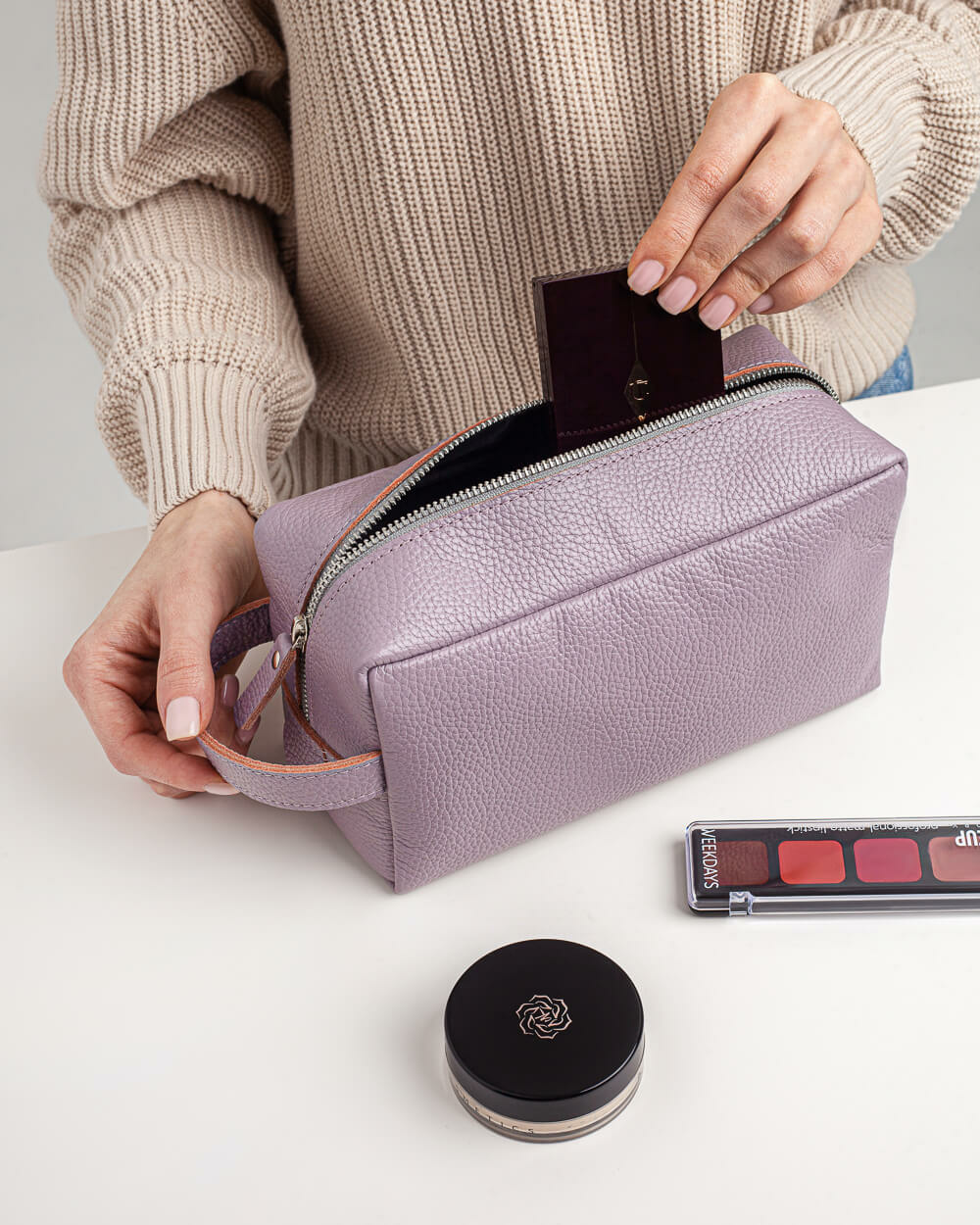 Кожаный несессер подойдет для поездок, походов в бассейн, спортзал или просто для хранения косметики. Изготовлен из мягкой эластичной натуральной кожи, внутри черная тканевая подкладка. Одно основное отделение вмещает косметические средства среднего или дорожного объема — шампунь, гель для душа, зубную пасту и щетку, расческу, кремы, влажные салфетки и другие повседневные вещи.