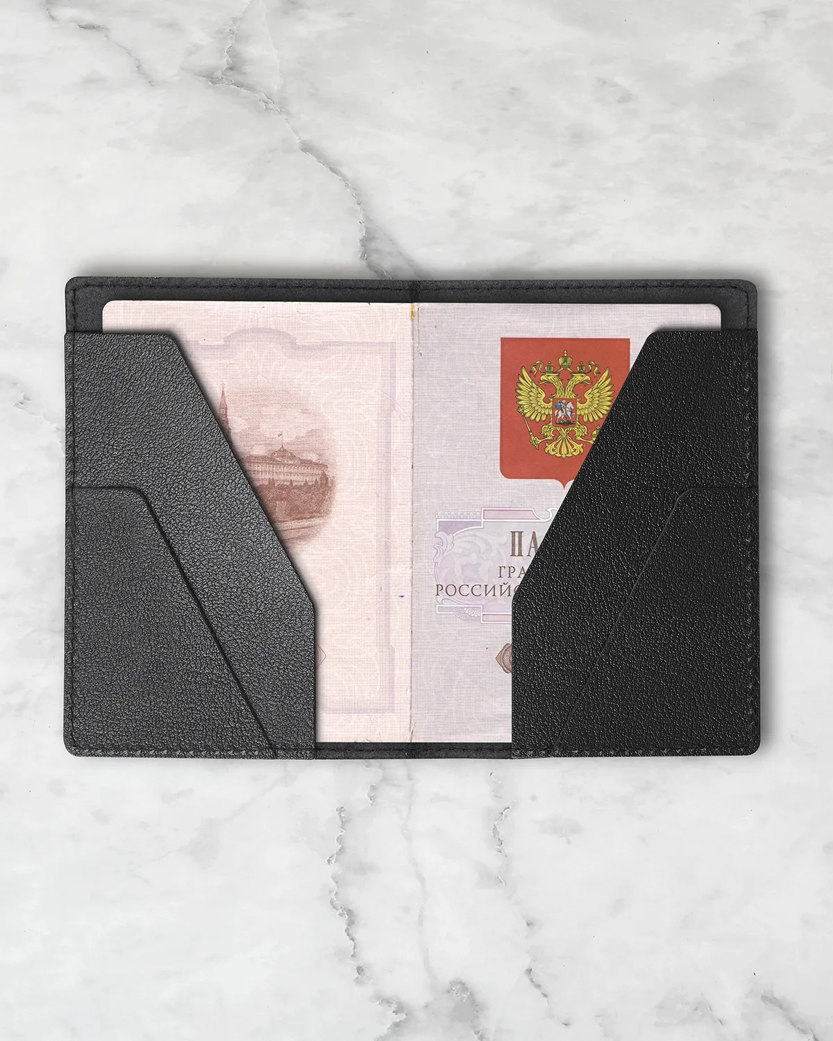 Обложка из плотной натуральной кожи подойдет для паспорта РФ или для загранпаспорта. Паспорт удобно доставать из обложки, нет ограничителей по верхнему краю. Внутри несколько кармашков для пластиковых карт, документов и купюр в сложенном виде.