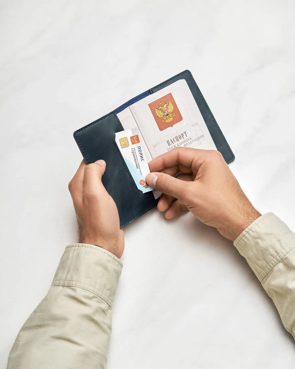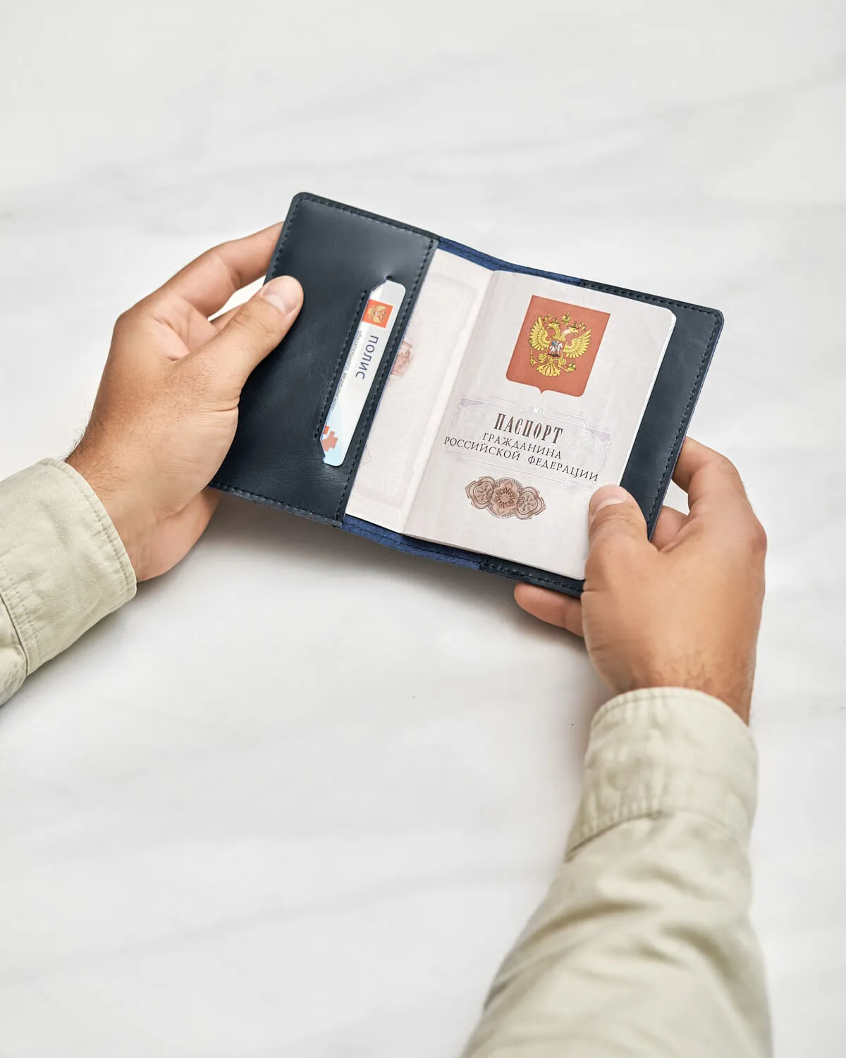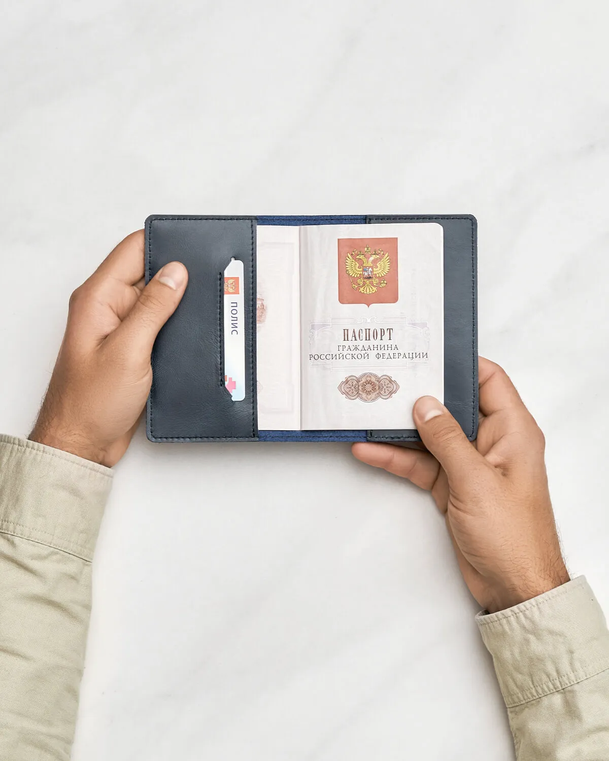 Обложка подойдет для паспорта РФ или загранпаспорта. Прорези внутри это кармашки для пластиковых карт или документов такого же формата, например, медицинского полиса или водительских прав.
