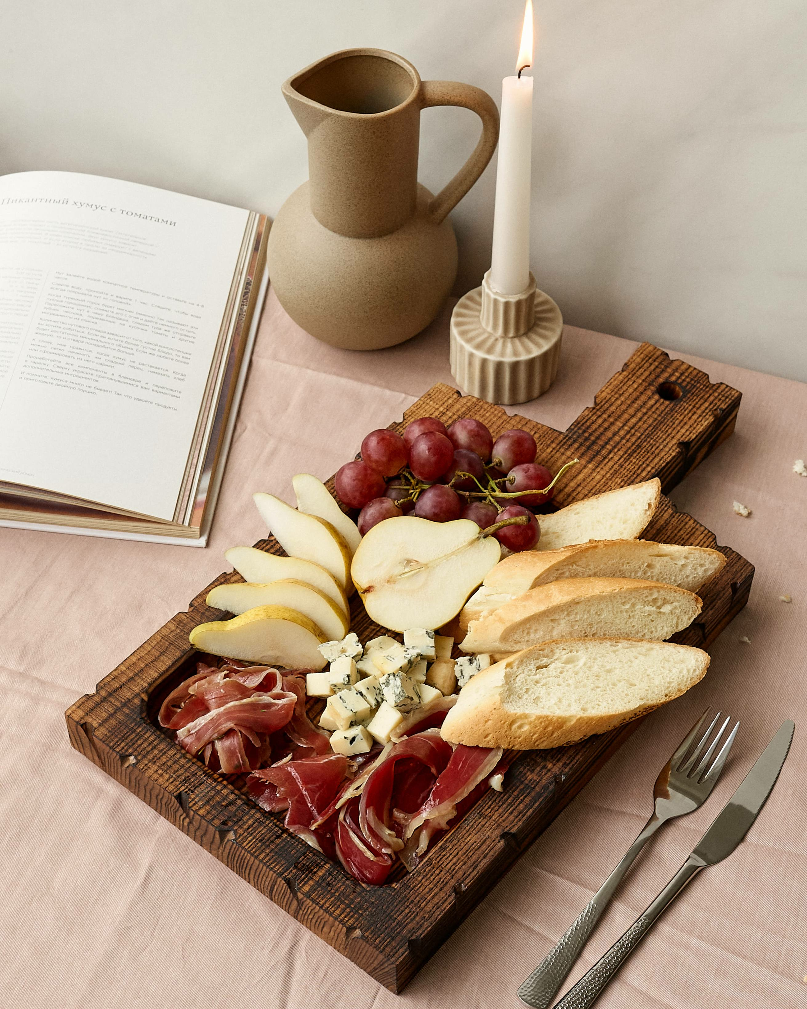 Мы обрабатываем доски сертифицированным немецким маслом, оно предназначено для безопасного контакта с пищевыми продуктами. Форма доски с углублением и бортиками подходит не только для закусок, но и для подачи стейков и других сочных блюд. Размер корпуса доски без учета ручки 33х23 см. Размер углубления на рабочей поверхности 26х18х1 см. Толщина доски около 3 см.