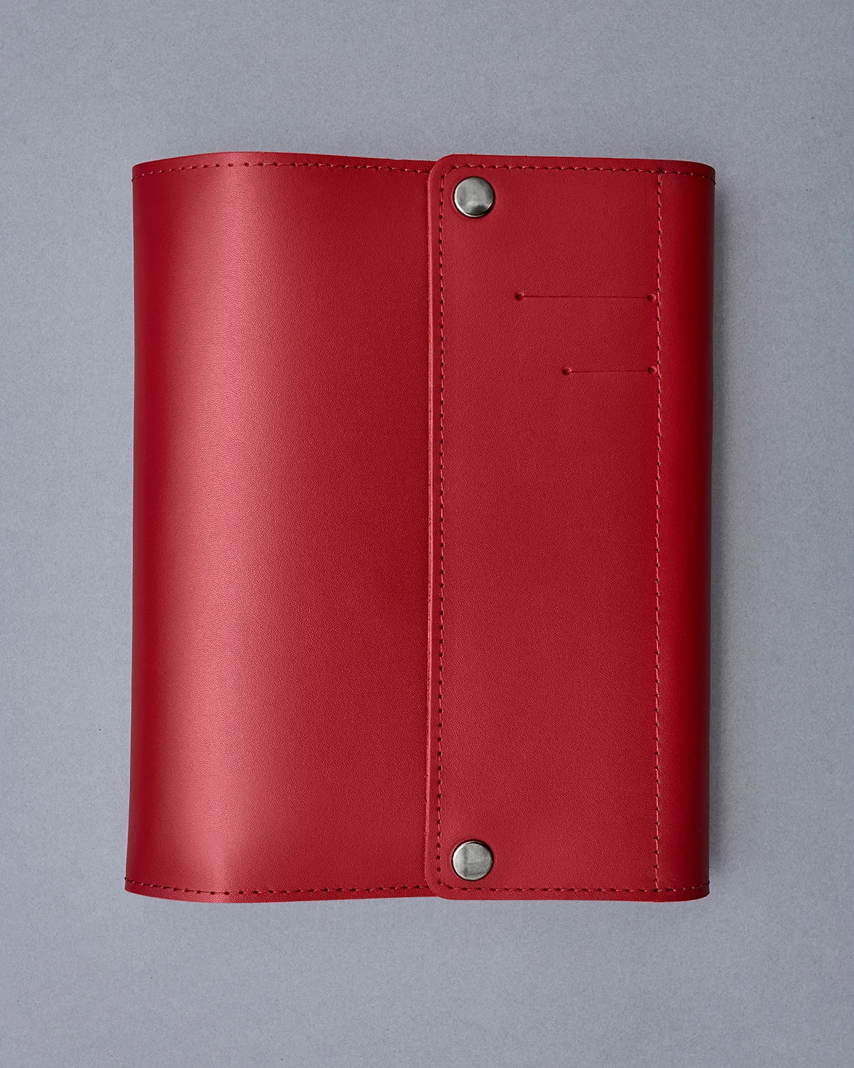 Красная натуральная кожа классической выделки — плотная, с гладкой поверхностью и высокой износостойкостью. У кожи едва заметная фактура в точку и естественная бархатистая изнанка.