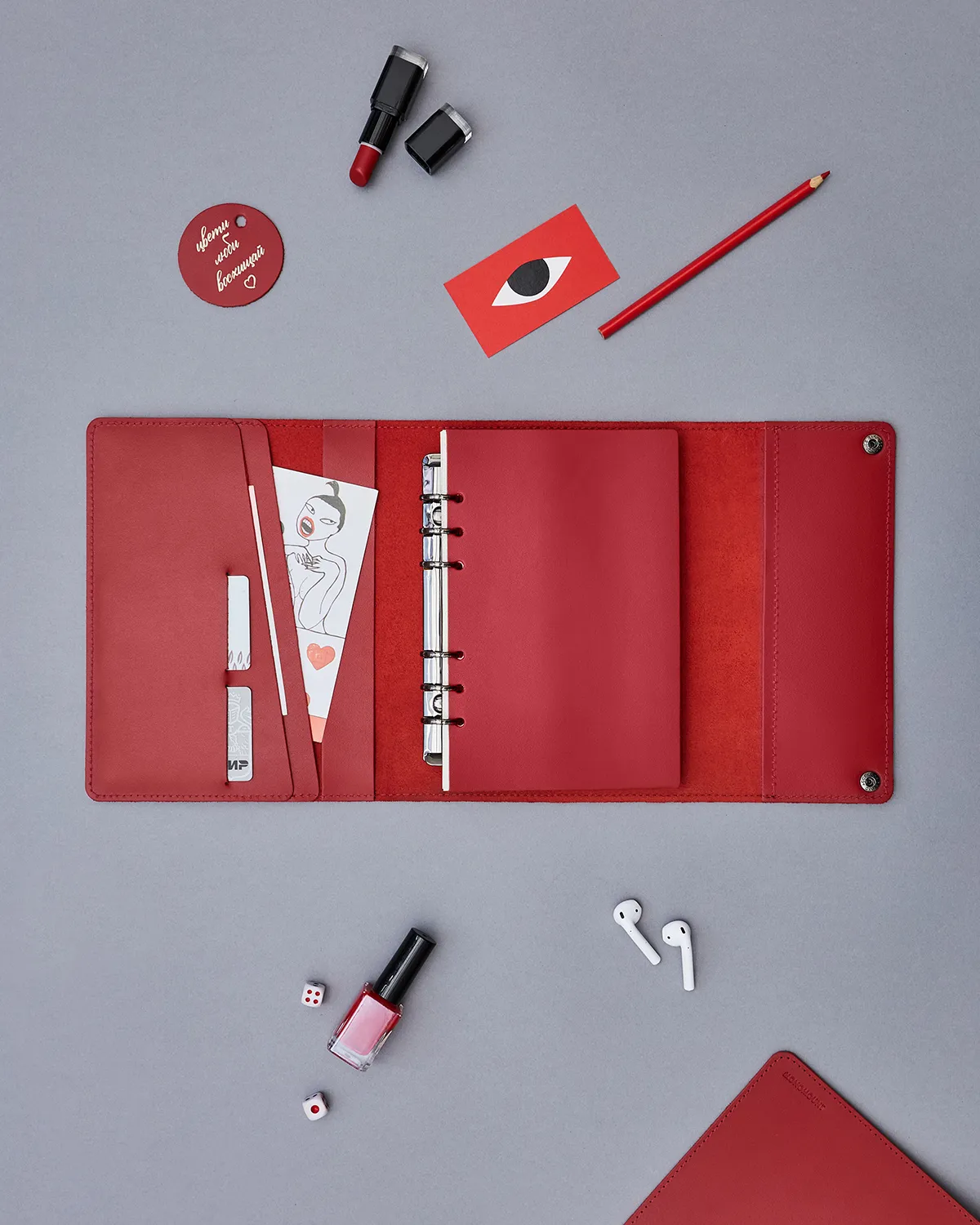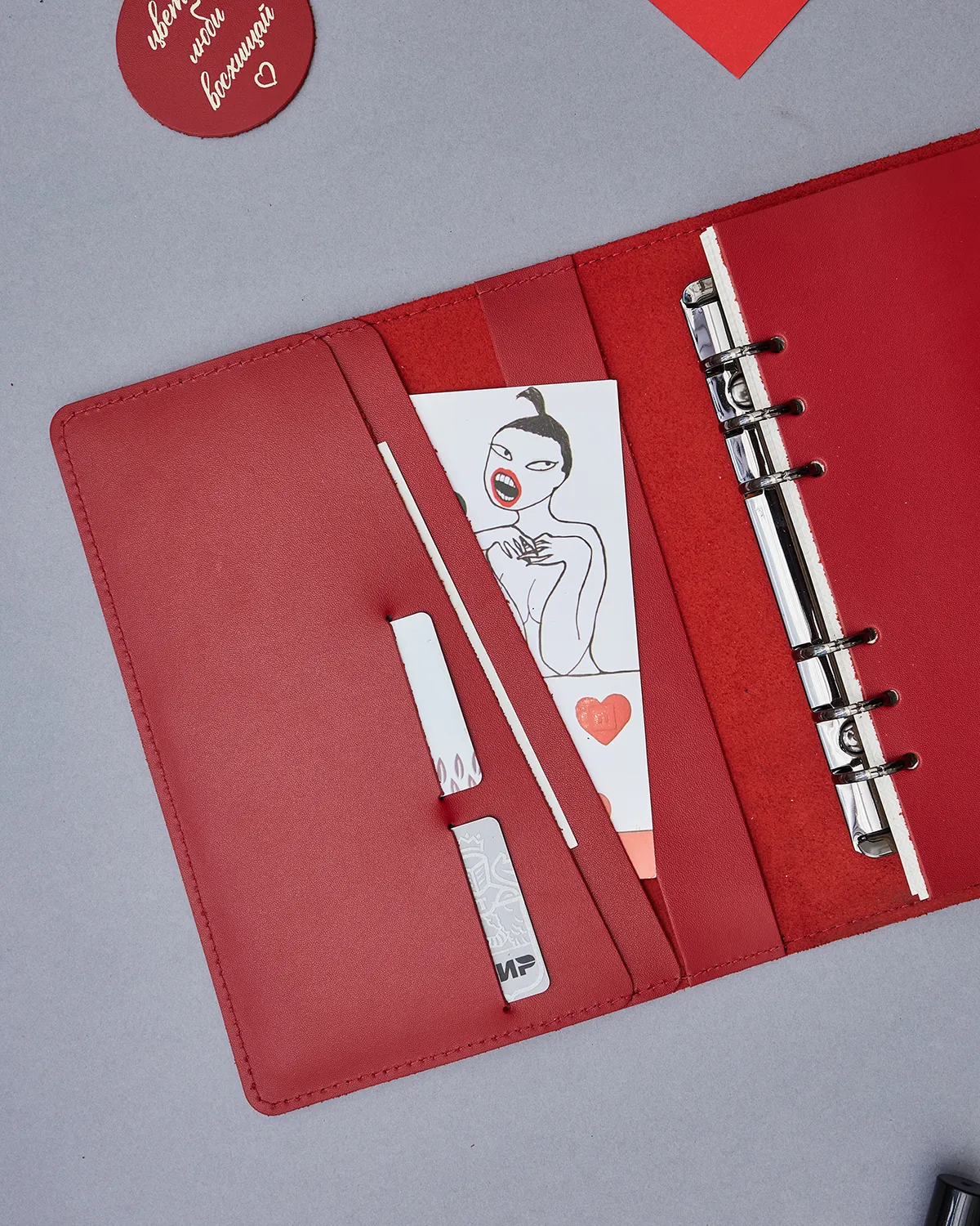 Выполняет роль органайзера — есть кармашки для бумаг, визиток, пишущих принадлежностей и других вложений. Застегивается на металлические кнопки.