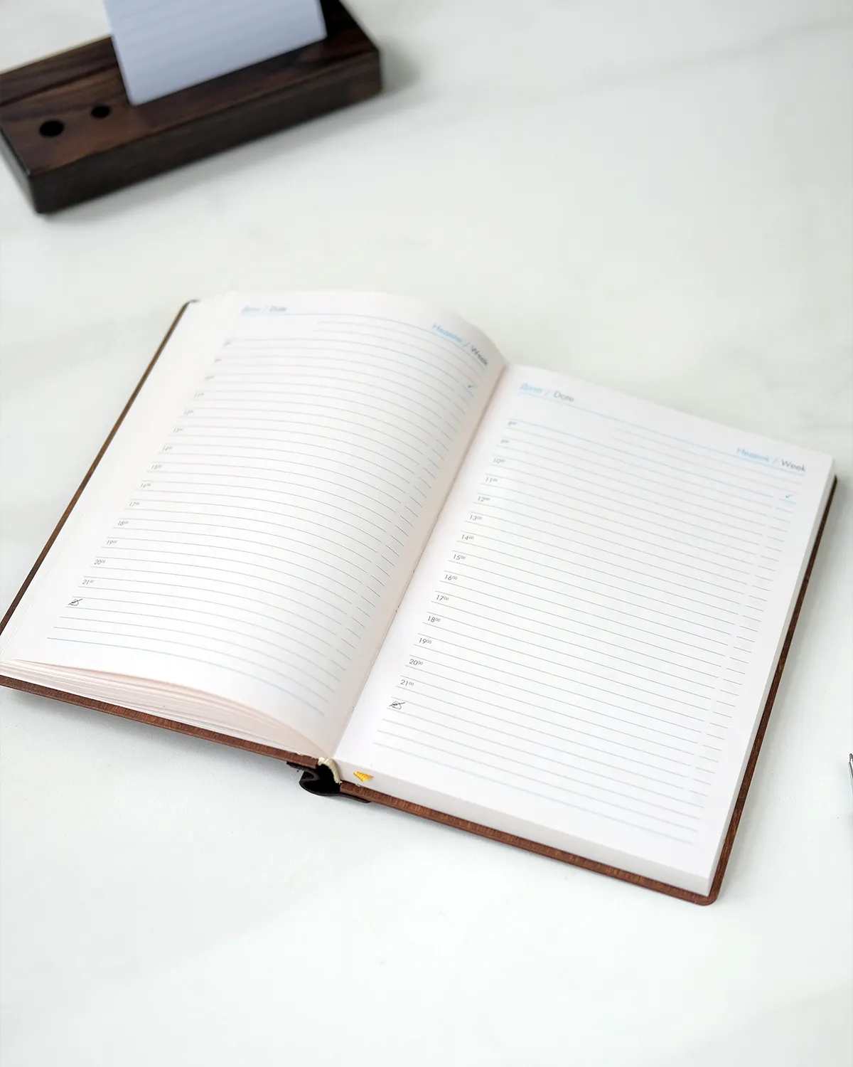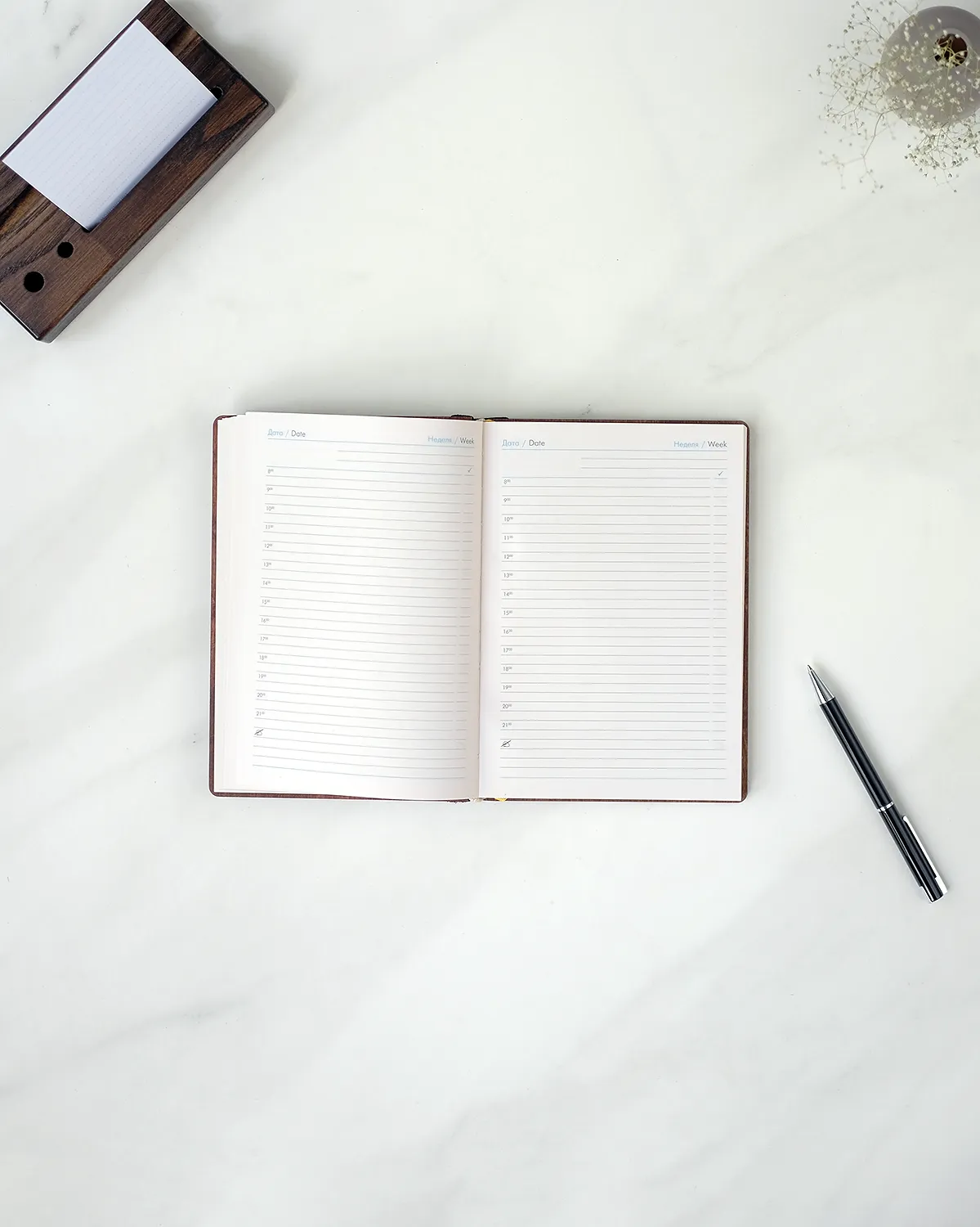 Недатированный деревянный ежедневник, 336 страниц, в начале ежедневника информационный блок: личные данные владельца, календари, планирование по месяцам и на год. Основные страницы с разметкой по часам, с 8:00 до 21:00, дата заполняется от руки.