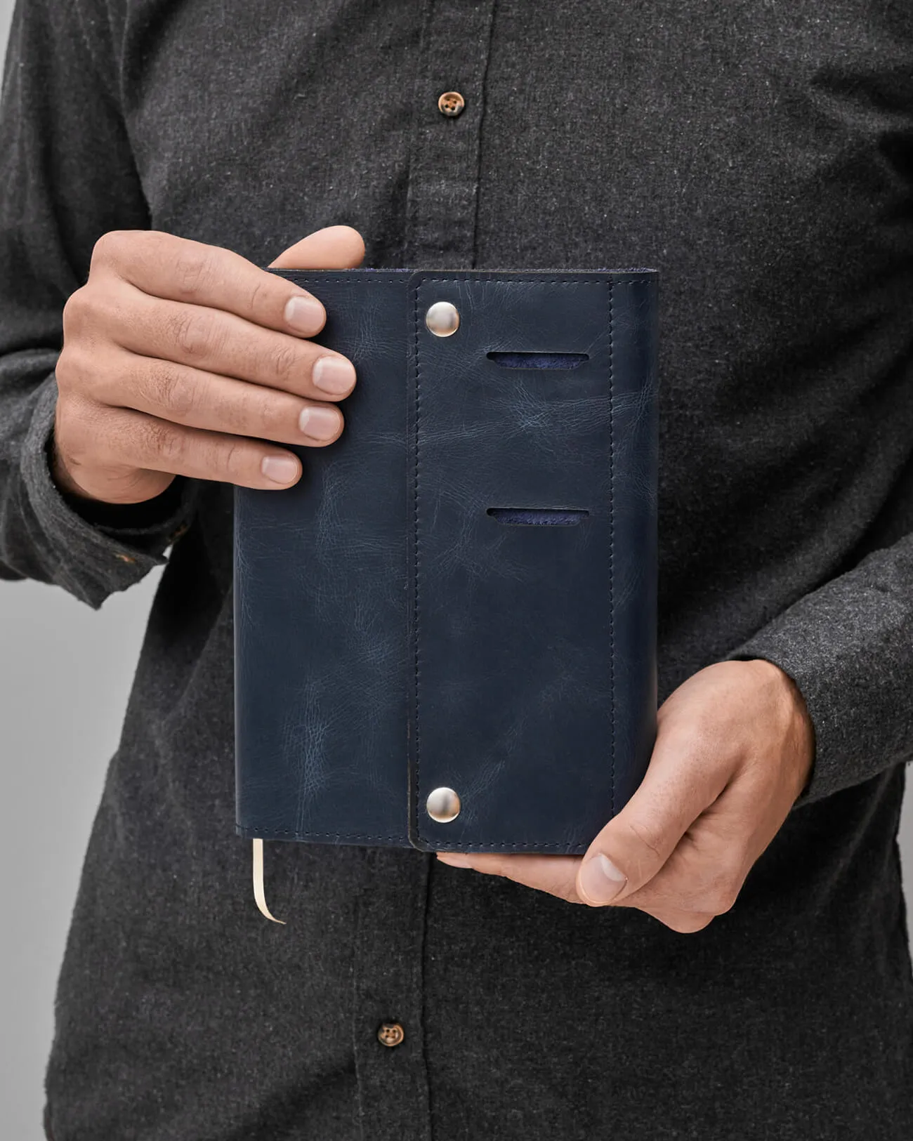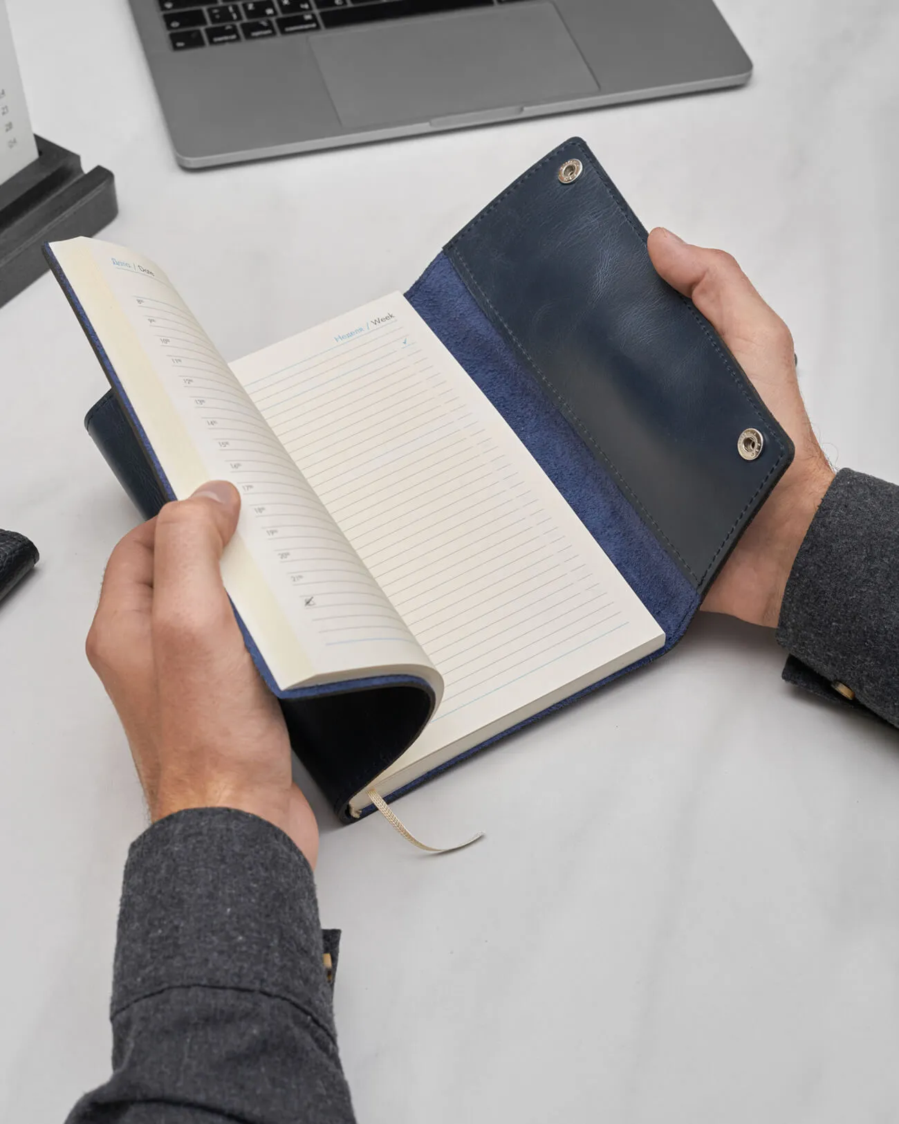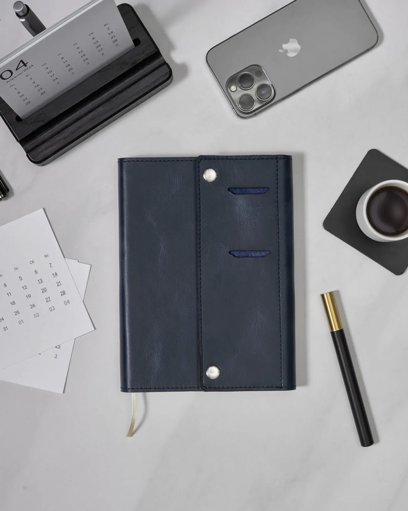 Ежедневник из натуральной кожи с кармашками-прорезями для ручки. Клапан на кнопках не даёт ежедневнику случайно раскрыться в сумке и защищает срез и уголки страниц от загибов и сминания.