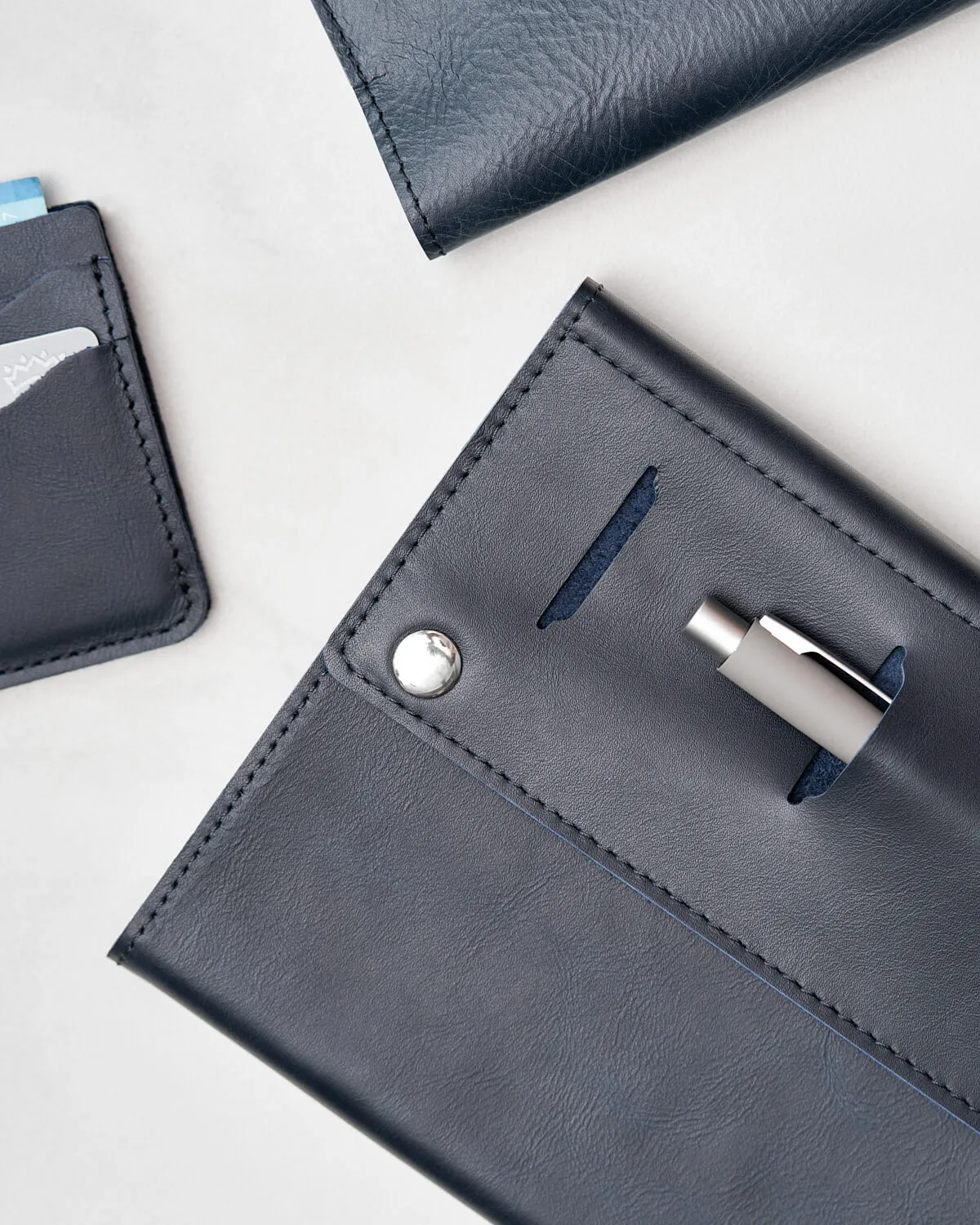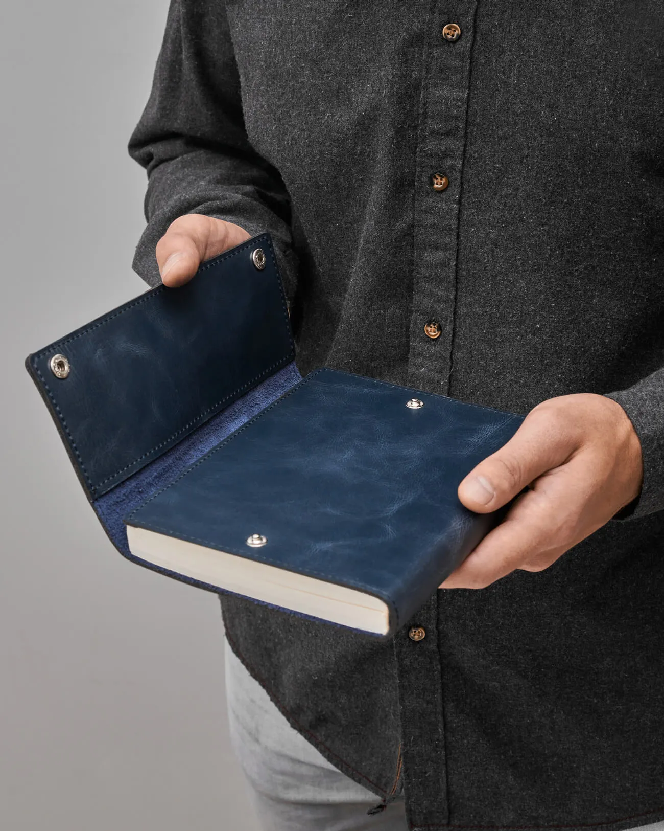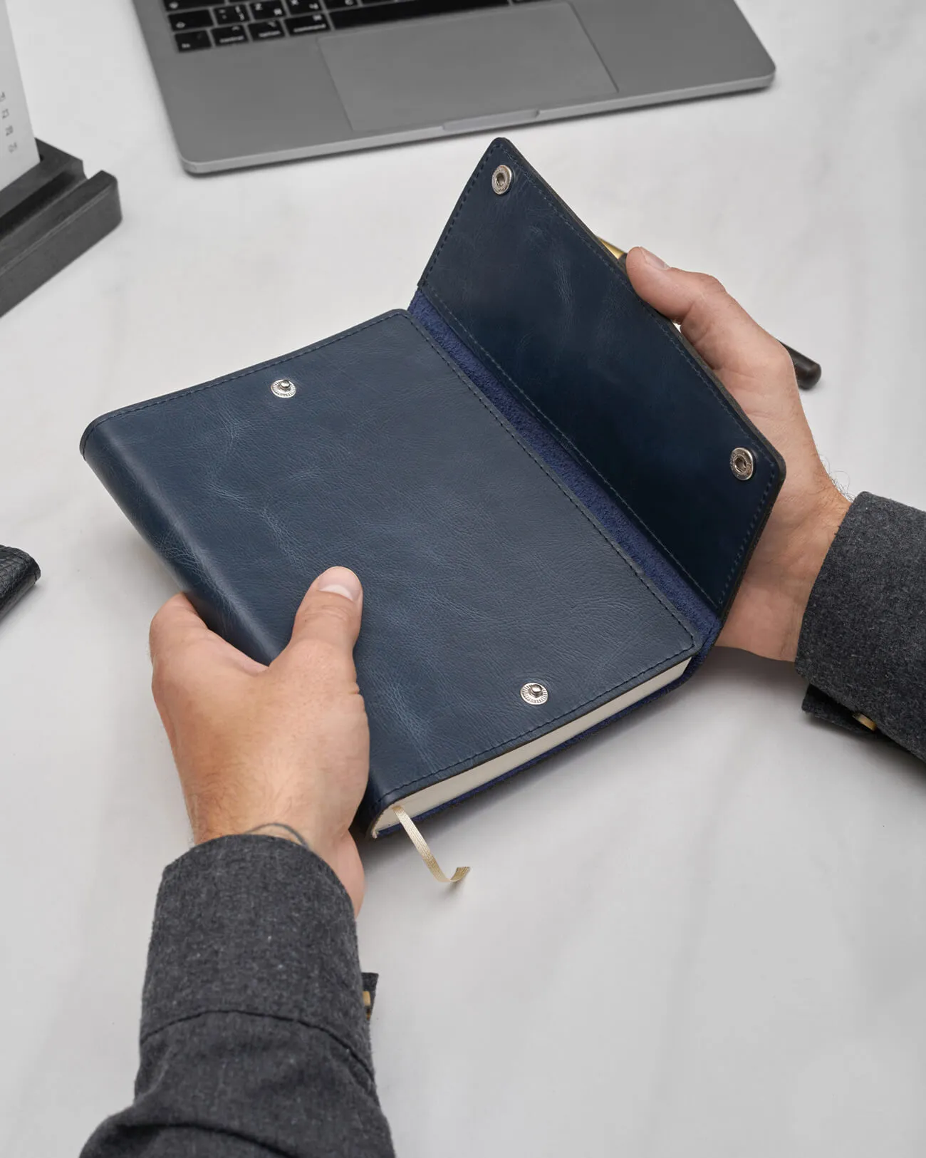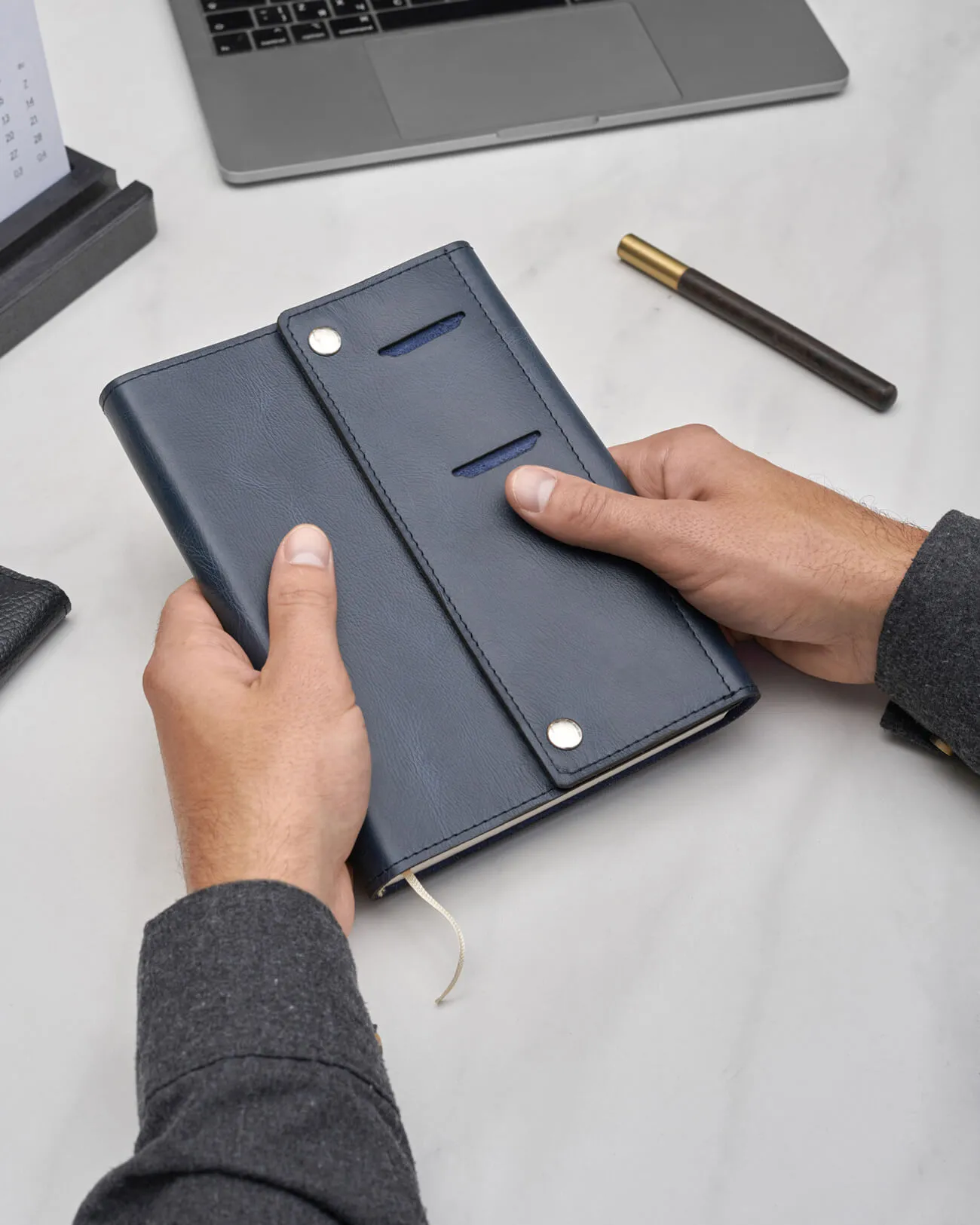Ежедневник из натуральной кожи с кармашками-прорезями для ручки. Клапан на кнопках не даёт ежедневнику случайно раскрыться в сумке и защищает срез и уголки страниц от загибов и сминания.