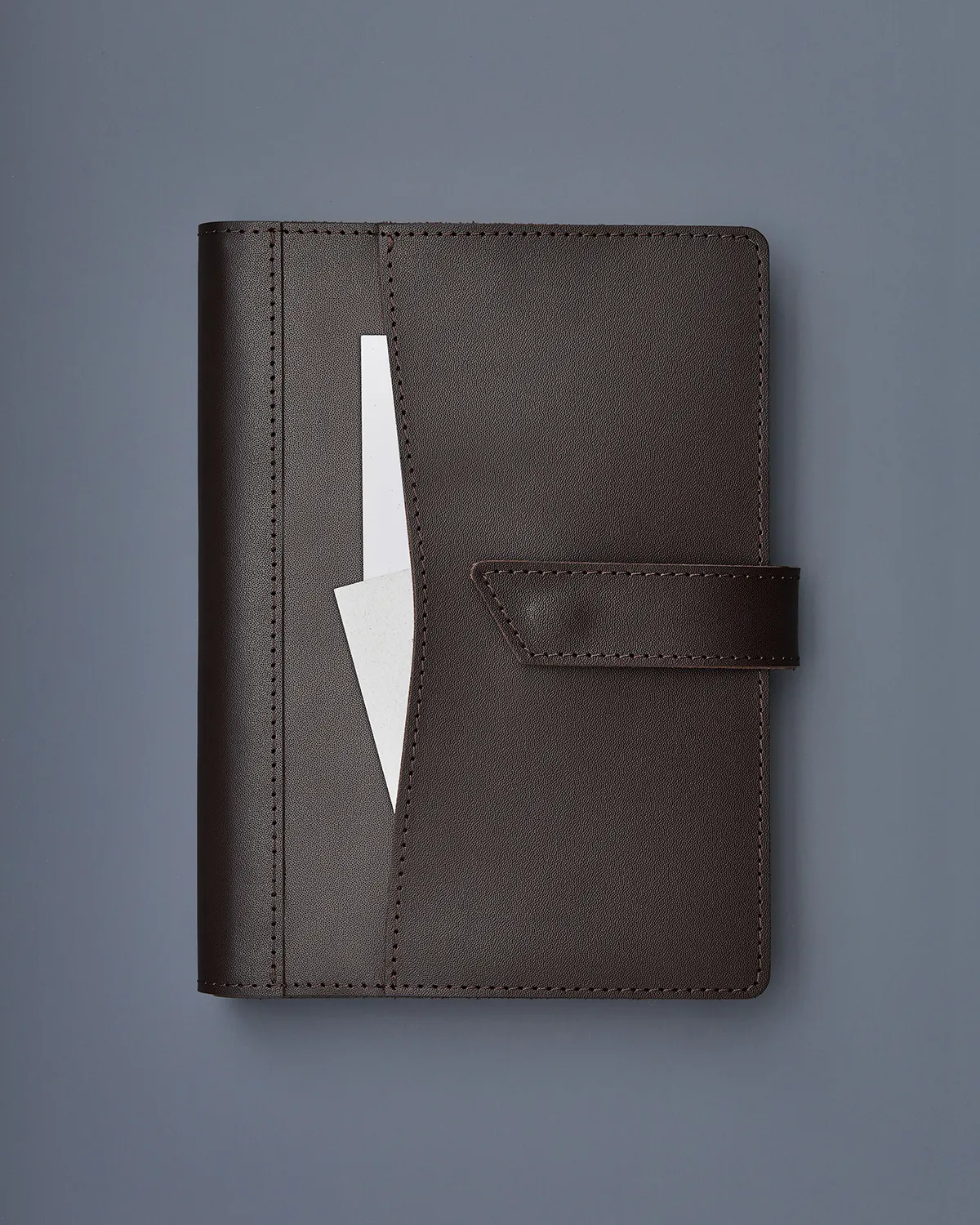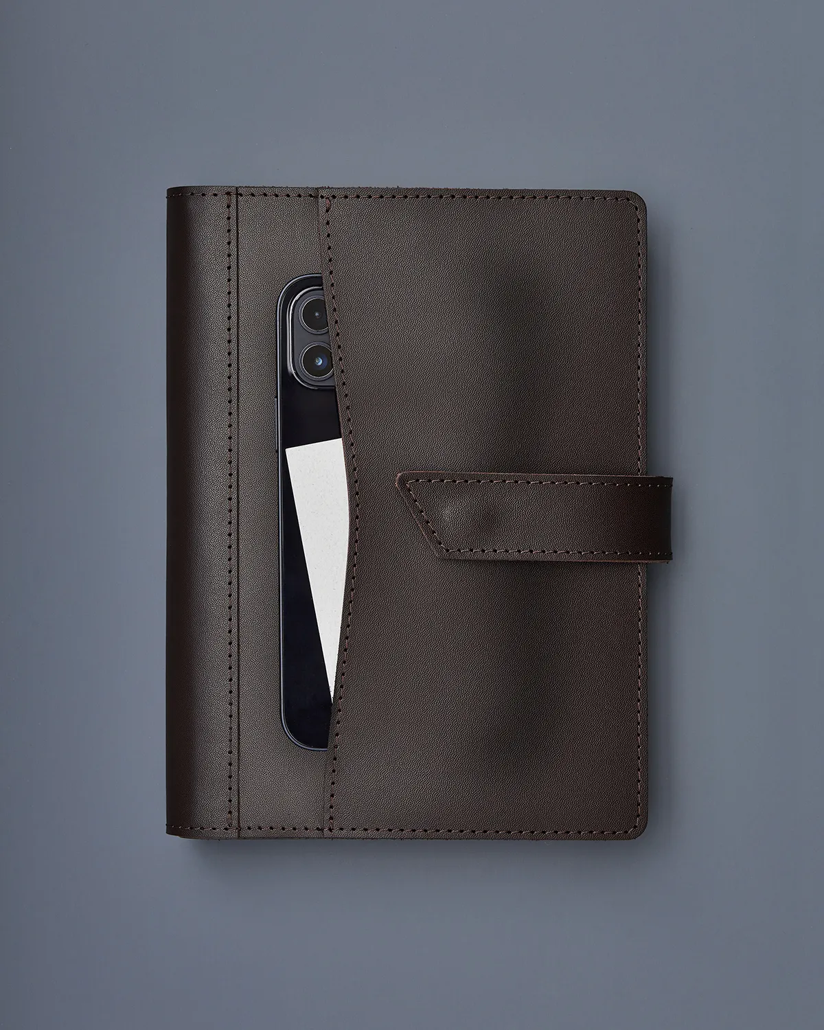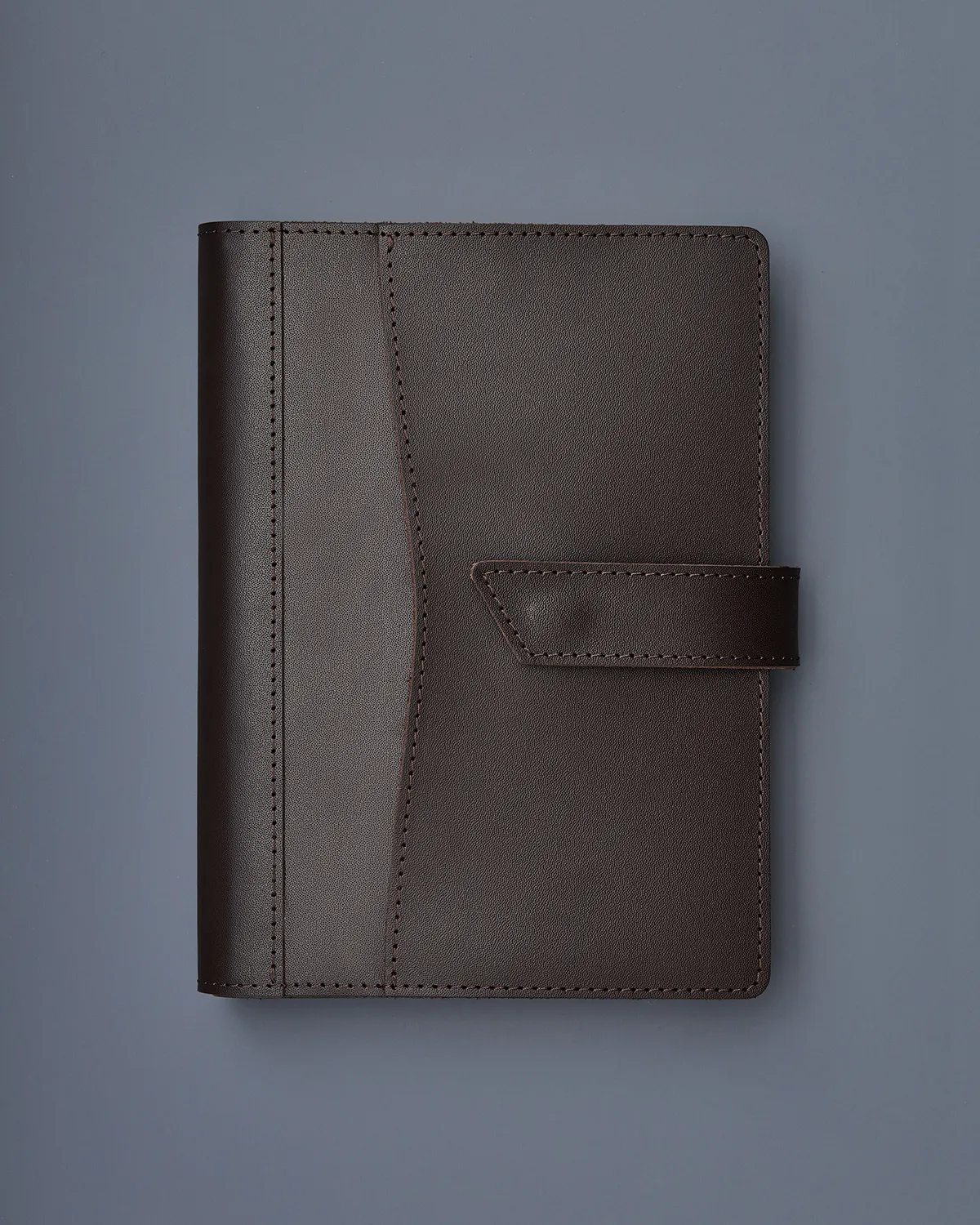 Ежедневник из натуральной кожи с кармашком спереди. Хлястик на магнитной кнопке не даёт ежедневнику случайно раскрыться в сумке и защищает срез и уголки страниц от загибов и сминания.