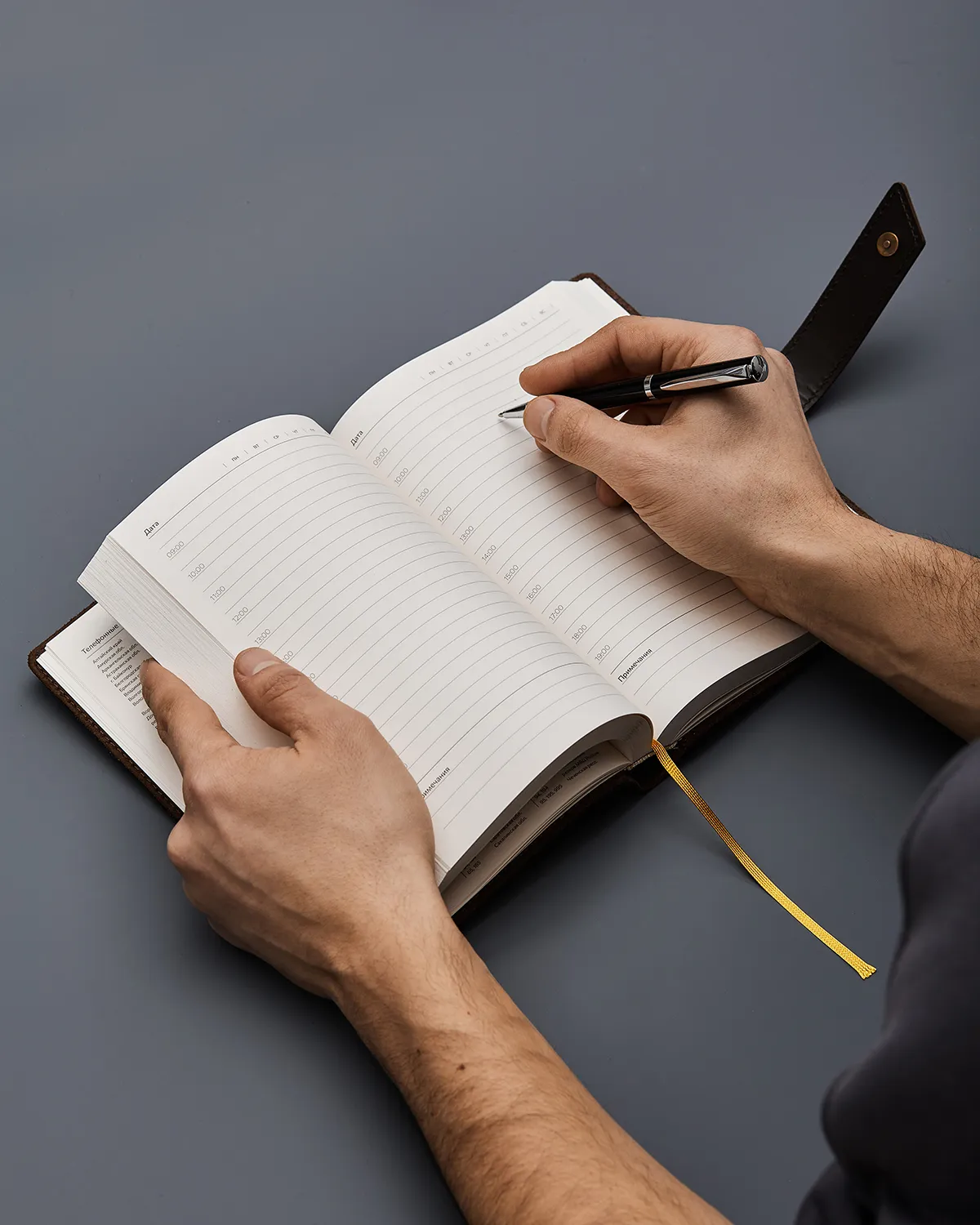 Блок ежедневника изготовлен из матовой бумаги кремового оттенка. Страницы недатированные, даты и дни недели заполняются от руки, можно вести записи в удобном личном графике.