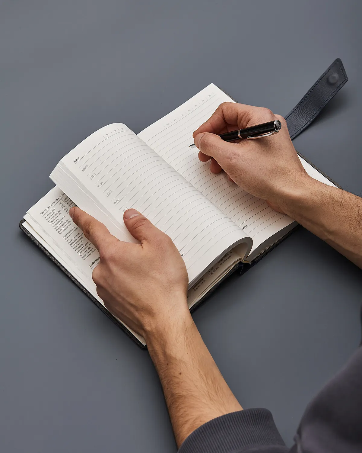 Блок ежедневника изготовлен из пигментированной бумаги кремового оттенка. Страницы недатированные, даты и дни недели заполняются от руки, можно вести записи в удобном личном графике.