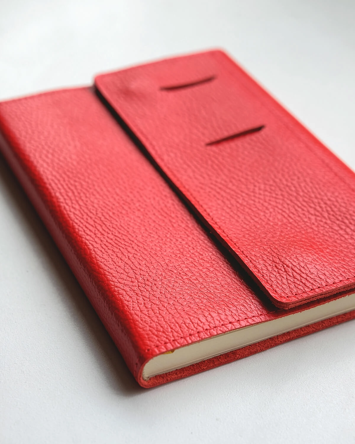 Кожаный блокнот с гибкой обложкой и кармашками-прорезями для ручки. Закрывается на магнитные кнопки.