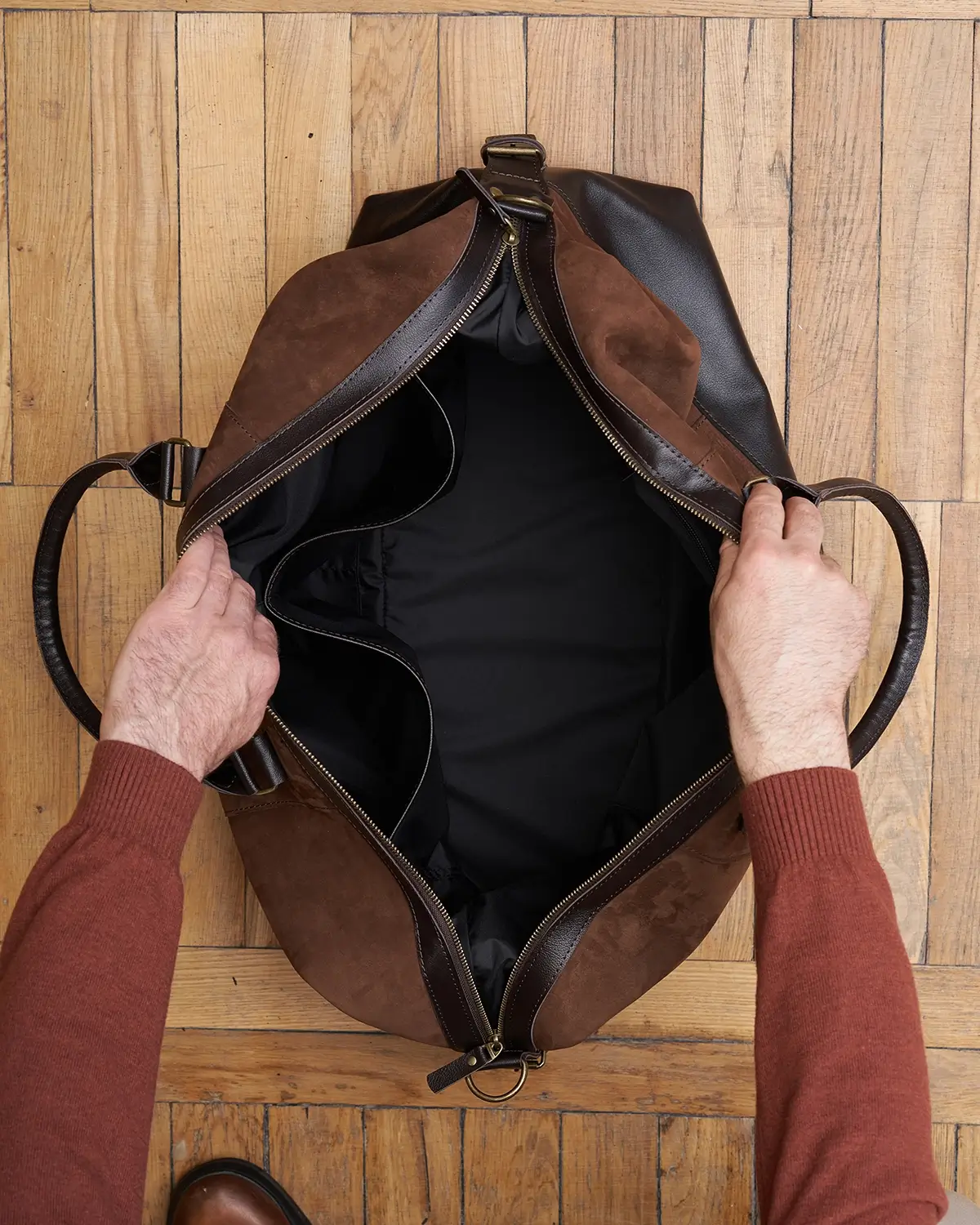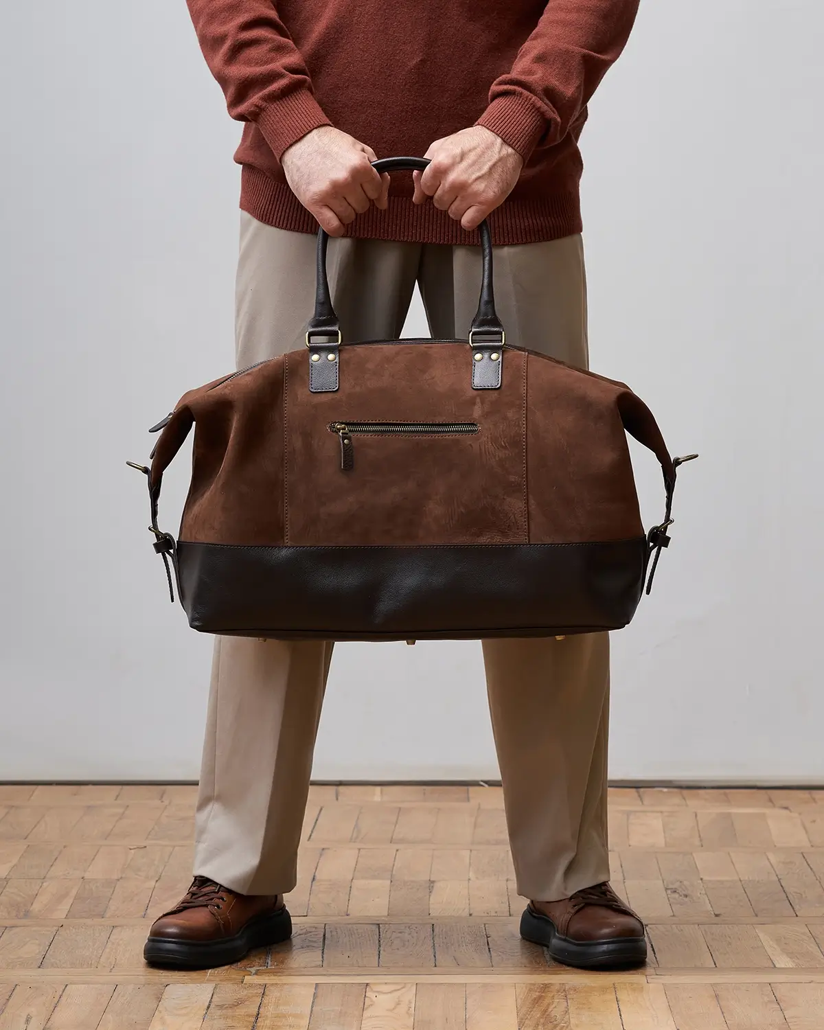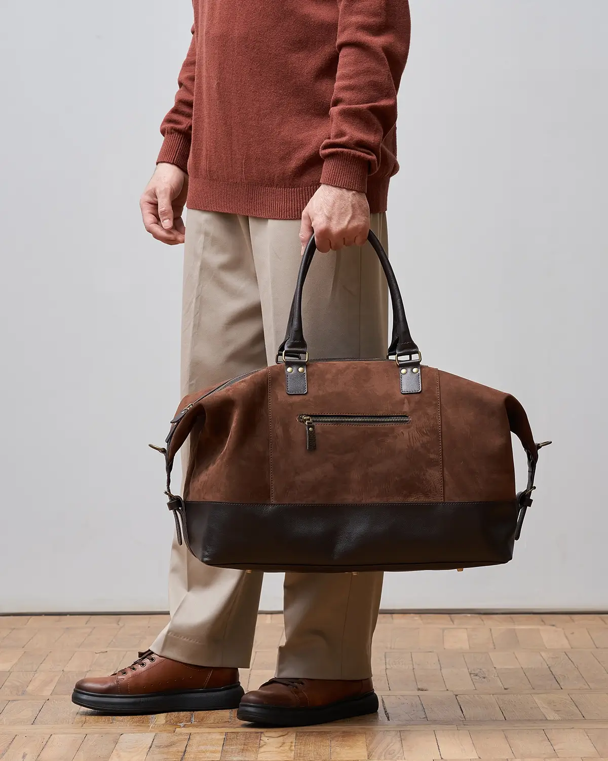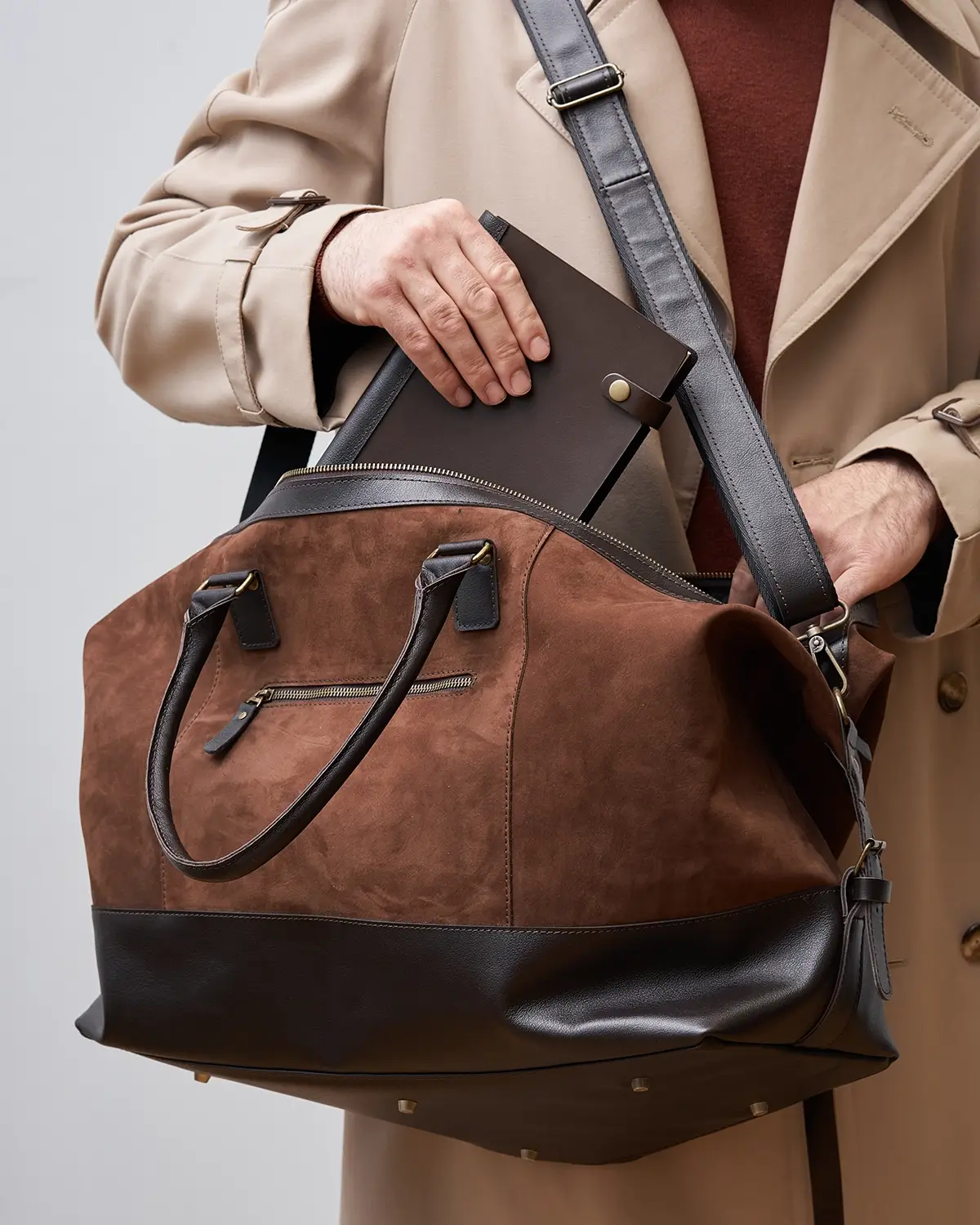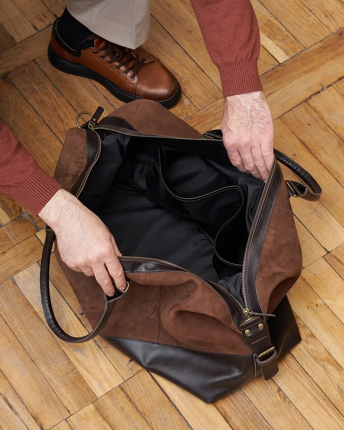 Изготовлена из натурального нубука, со временем становится мягче и приобретает потёртости. Для большей износостойкости дно, ручки и другие элементы изготовлены из гладкой классической кожи.