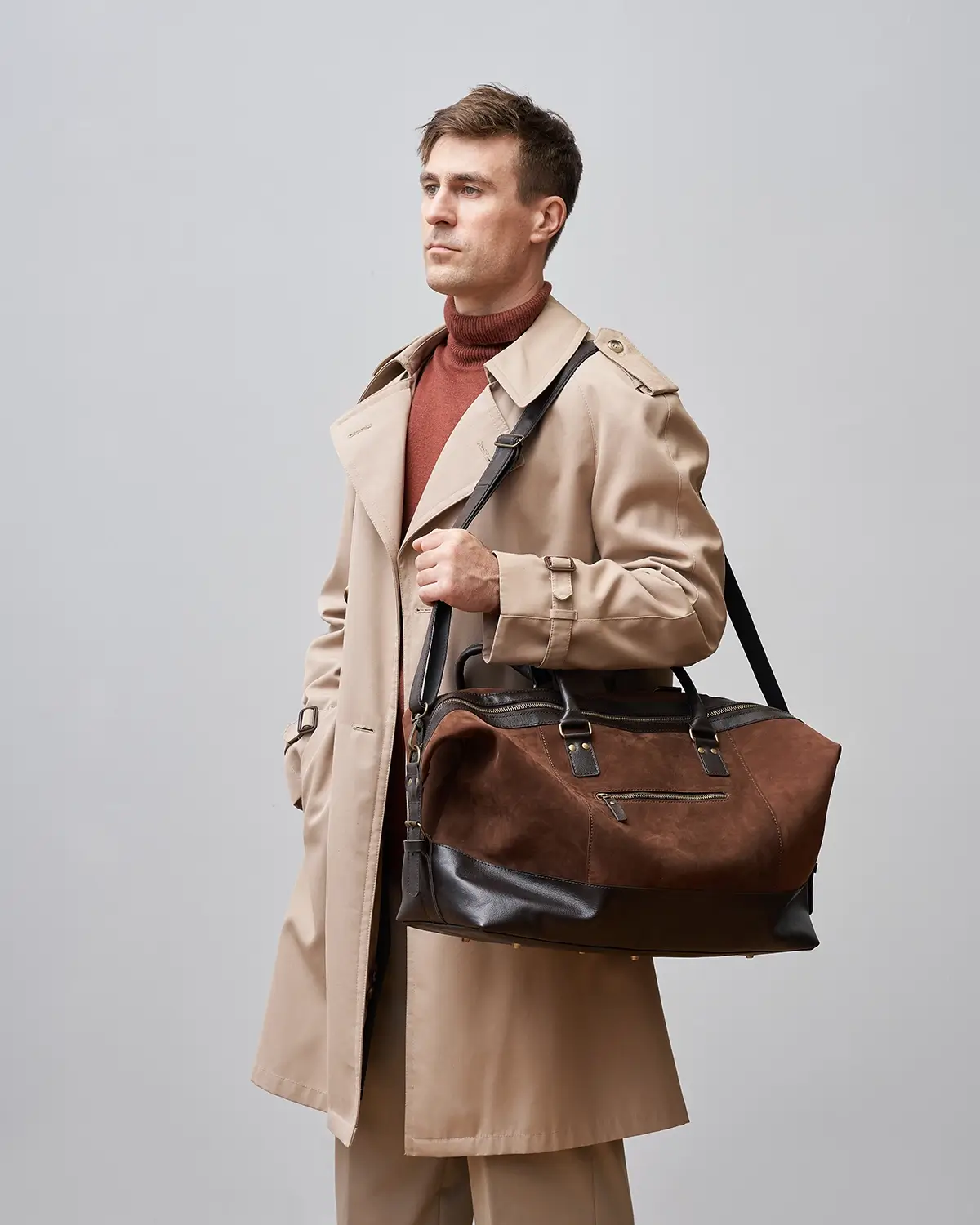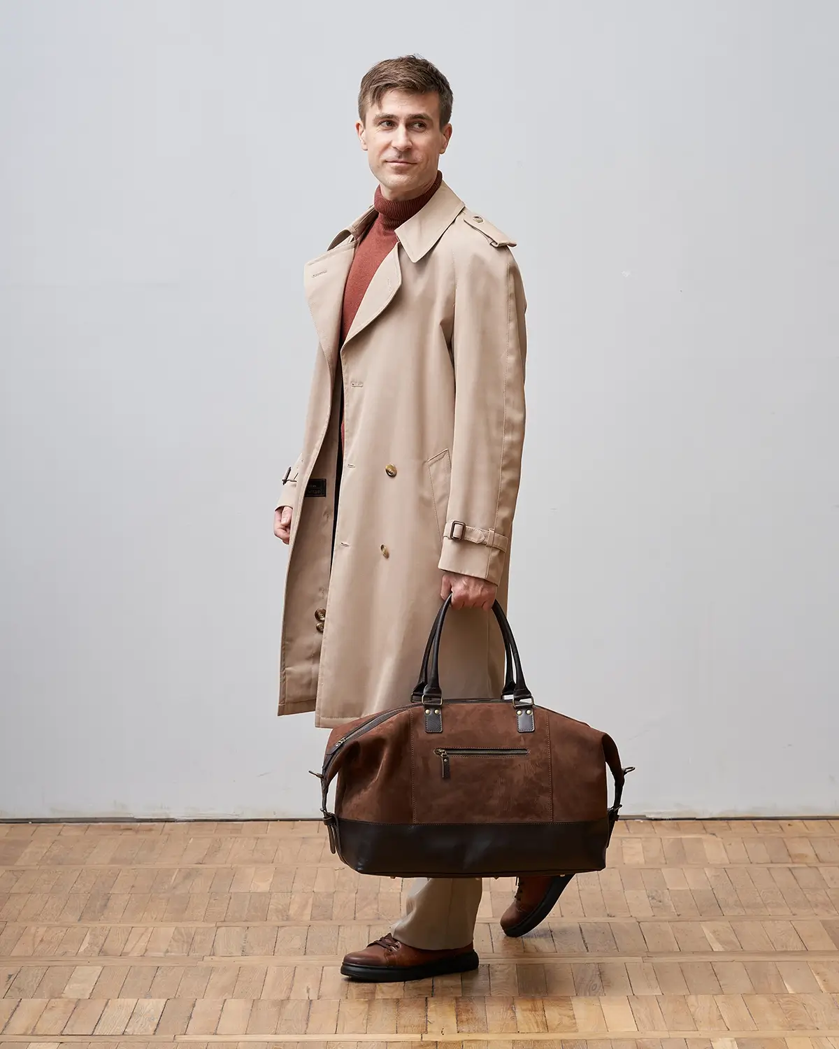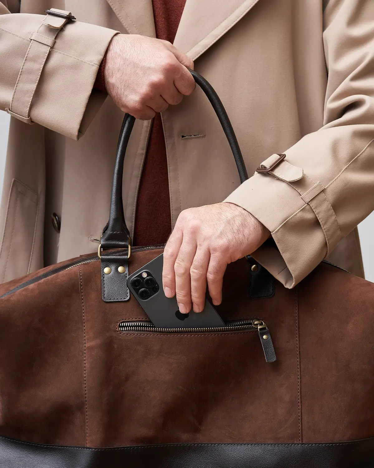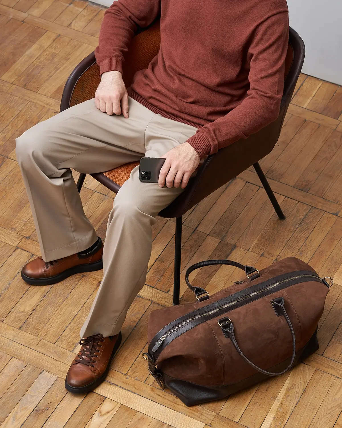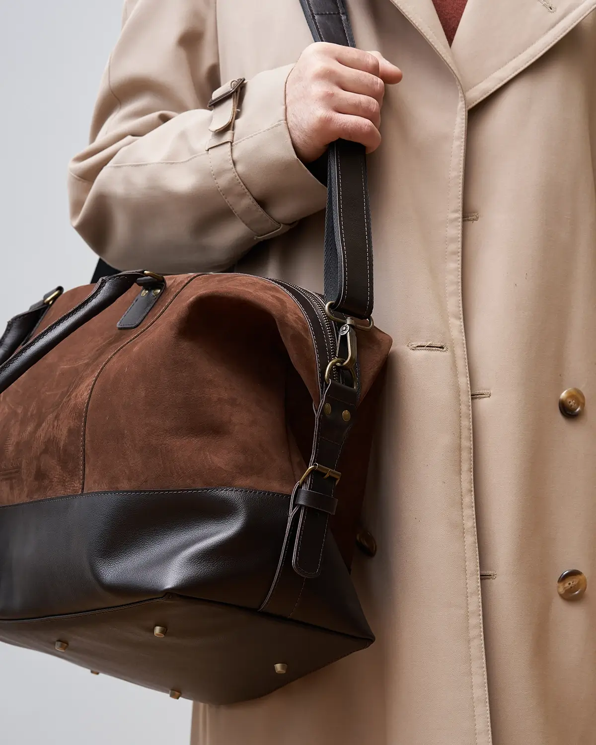 Изготовлена из натурального нубука, со временем становится мягче и приобретает потёртости. Для большей износостойкости дно, ручки и другие элементы изготовлены из гладкой классической кожи.