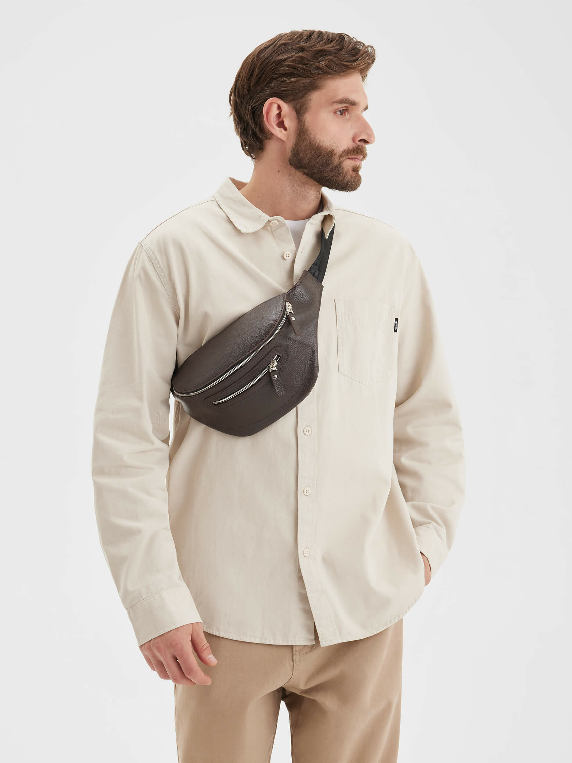 Кожаная поясная сумка — мужская или унисекс. Носите на поясе или на груди. Три отделения: - передний карман: плоский, рекомендуем носить в нём пластиковые карты, визитки; - задний карман: в нём удобно носить паспорт; молния аккуратно скрыта кожаными элементами; - основное отделение.