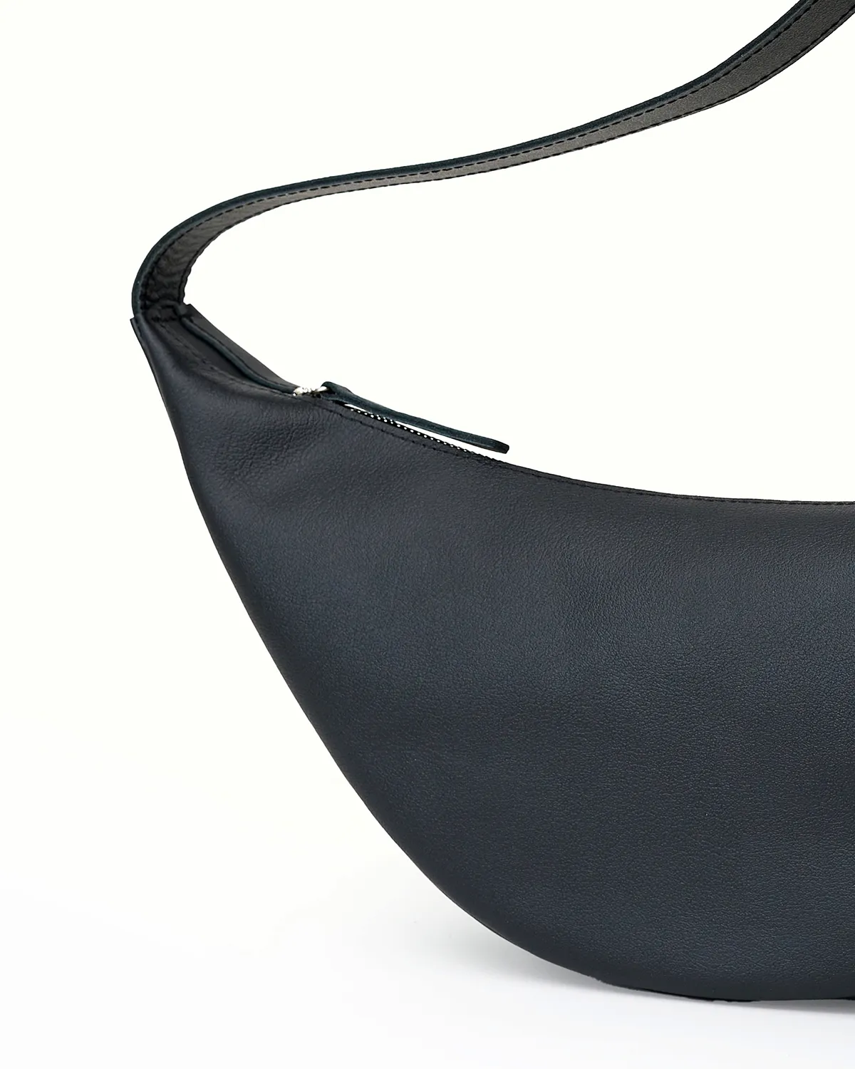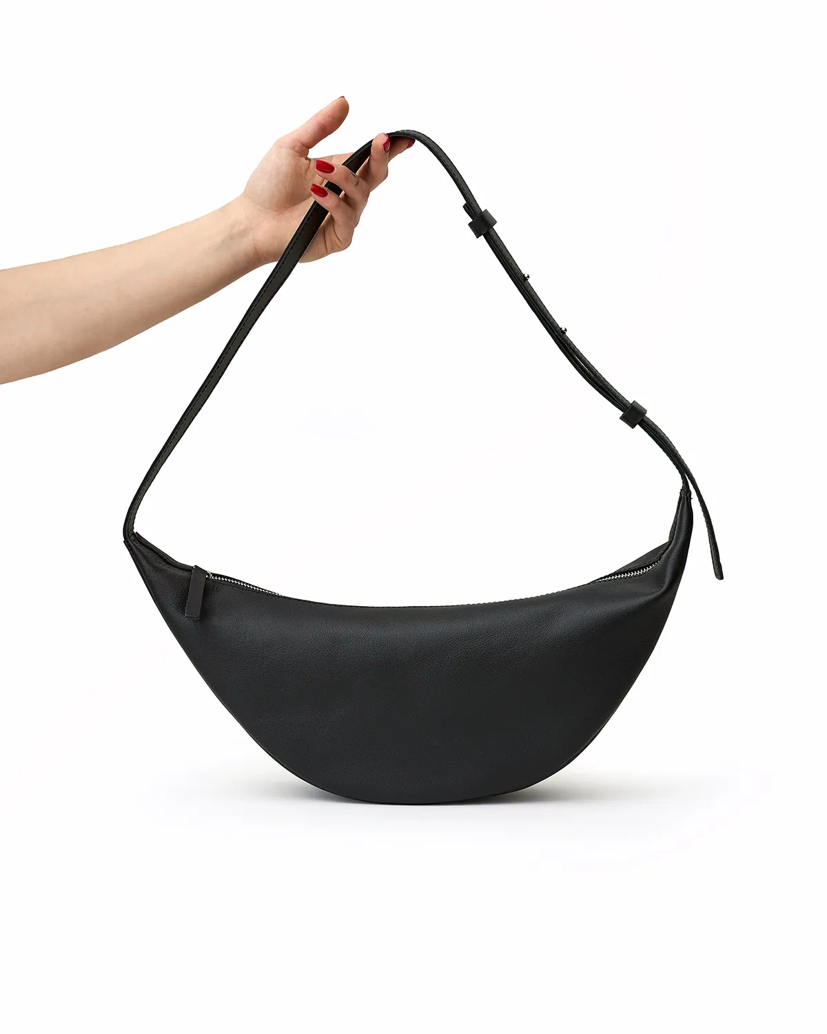 Сумка-хобо или сумка-мешок в форме полумесяца. Мягкая, комфортная и вместительная. Можно носить на плече, кросс-боди или просто в руках — длина ремня регулируется. Внутри подкладка и боковой кармашек на молнии.