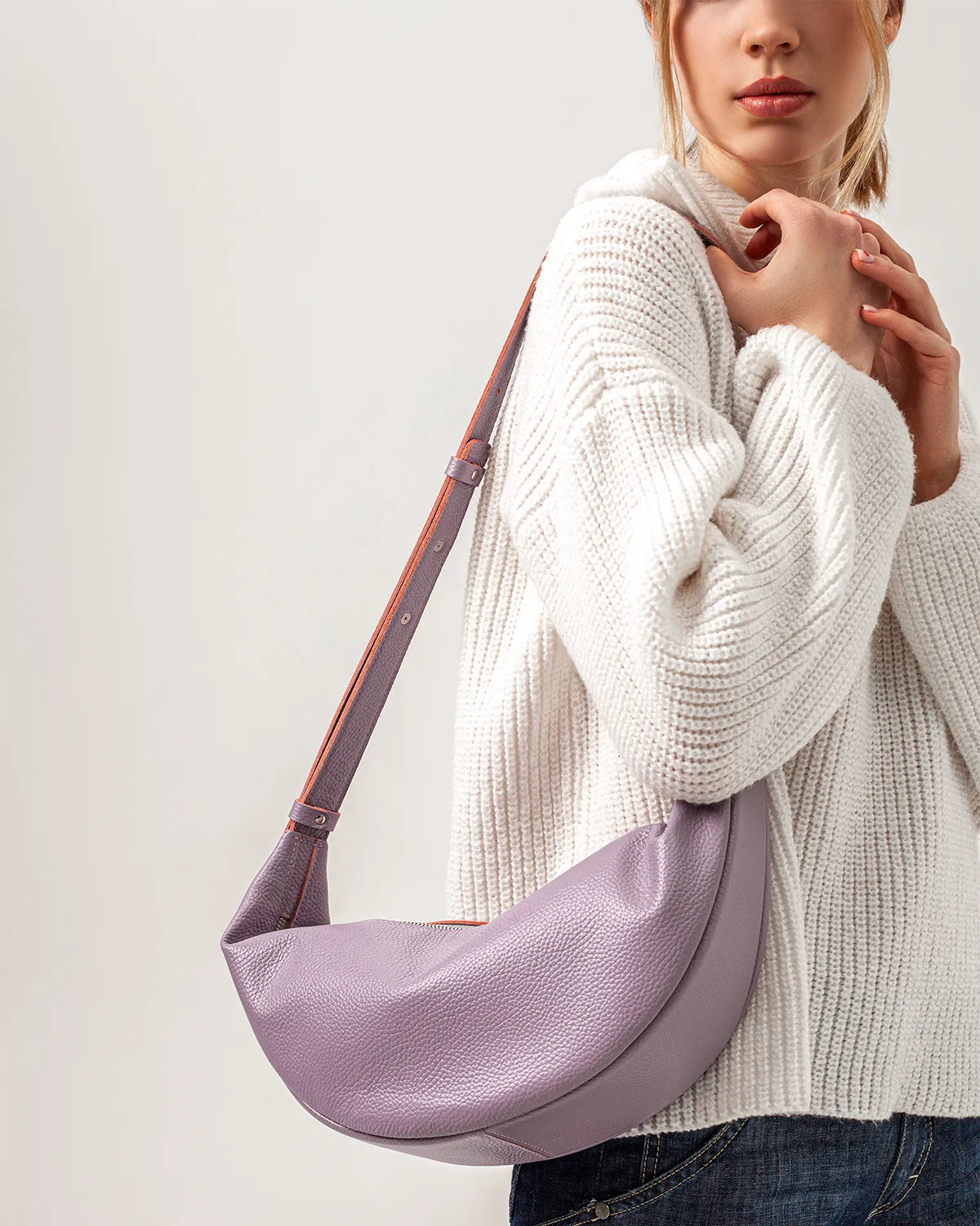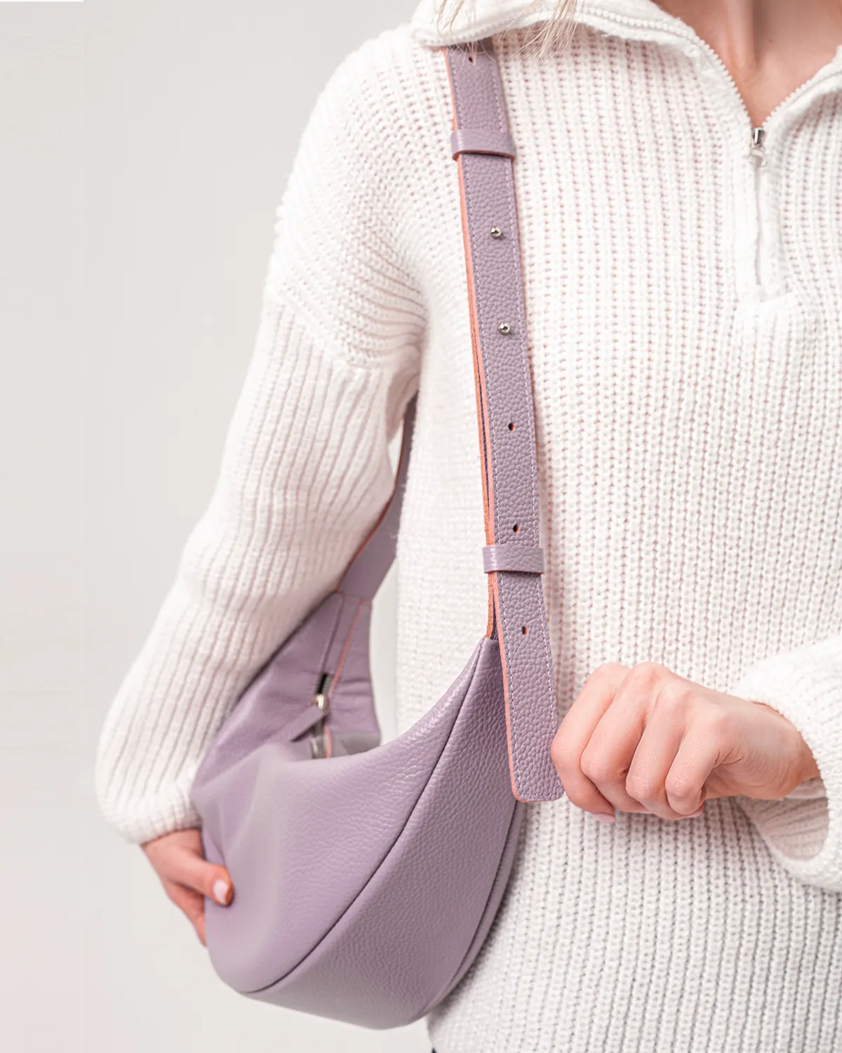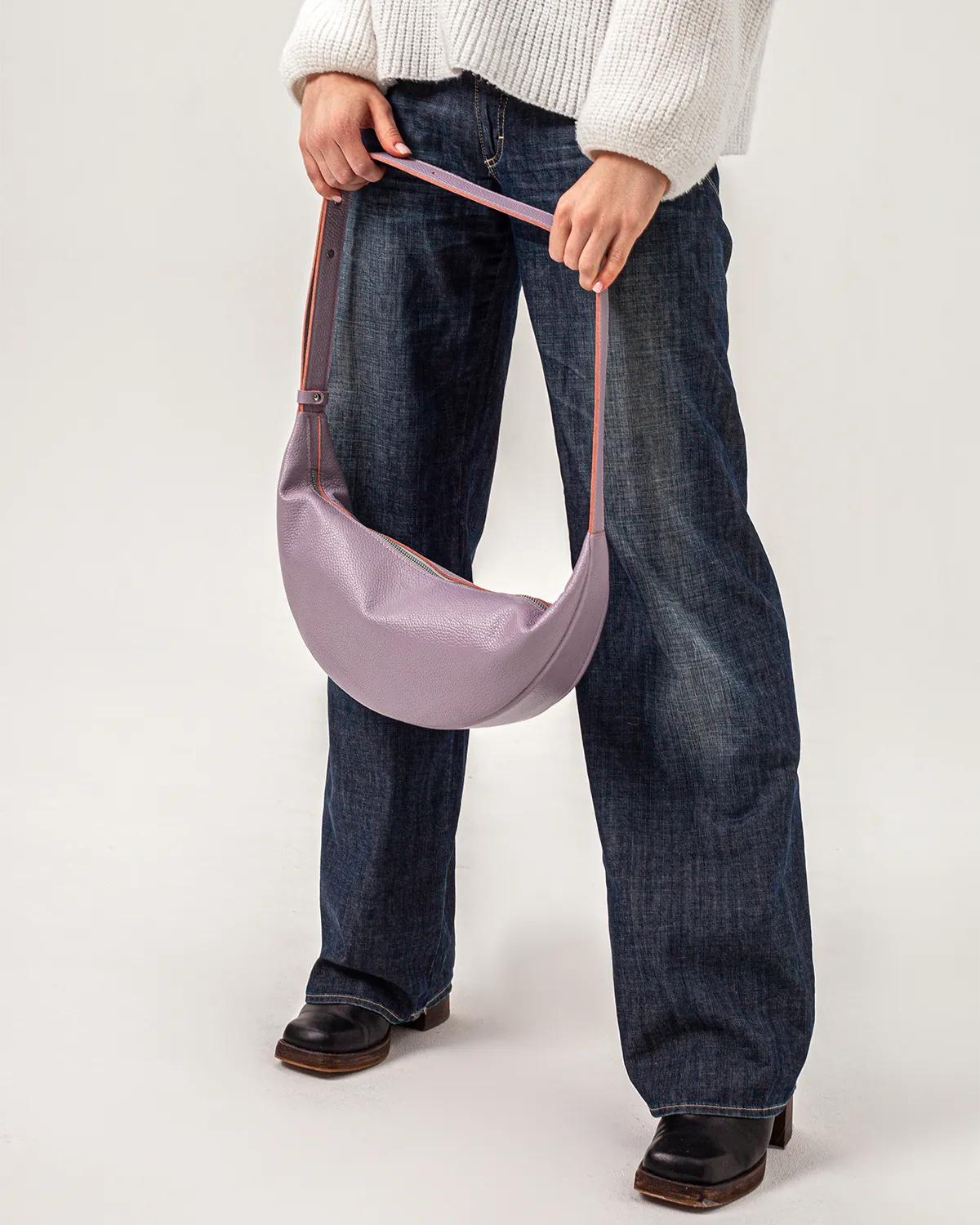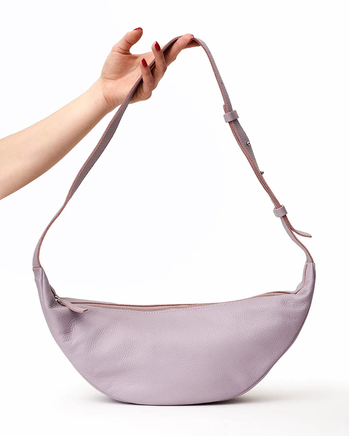 Сумка-хобо или сумка-мешок в форме полумесяца. Мягкая, комфортная и вместительная. Можно носить на плече, кросс-боди или просто в руках — длина ремня регулируется. Внутри подкладка и боковой кармашек на молнии.