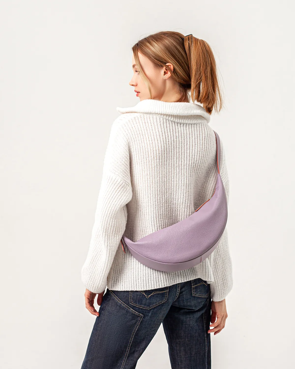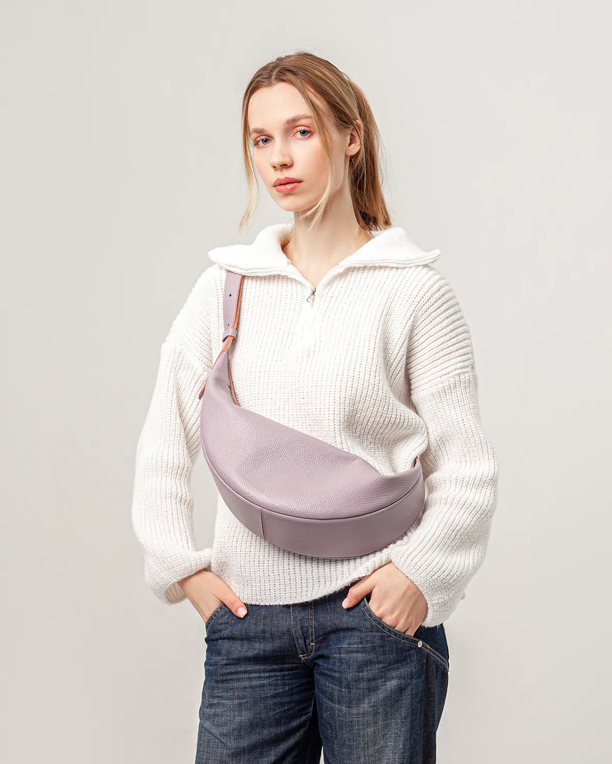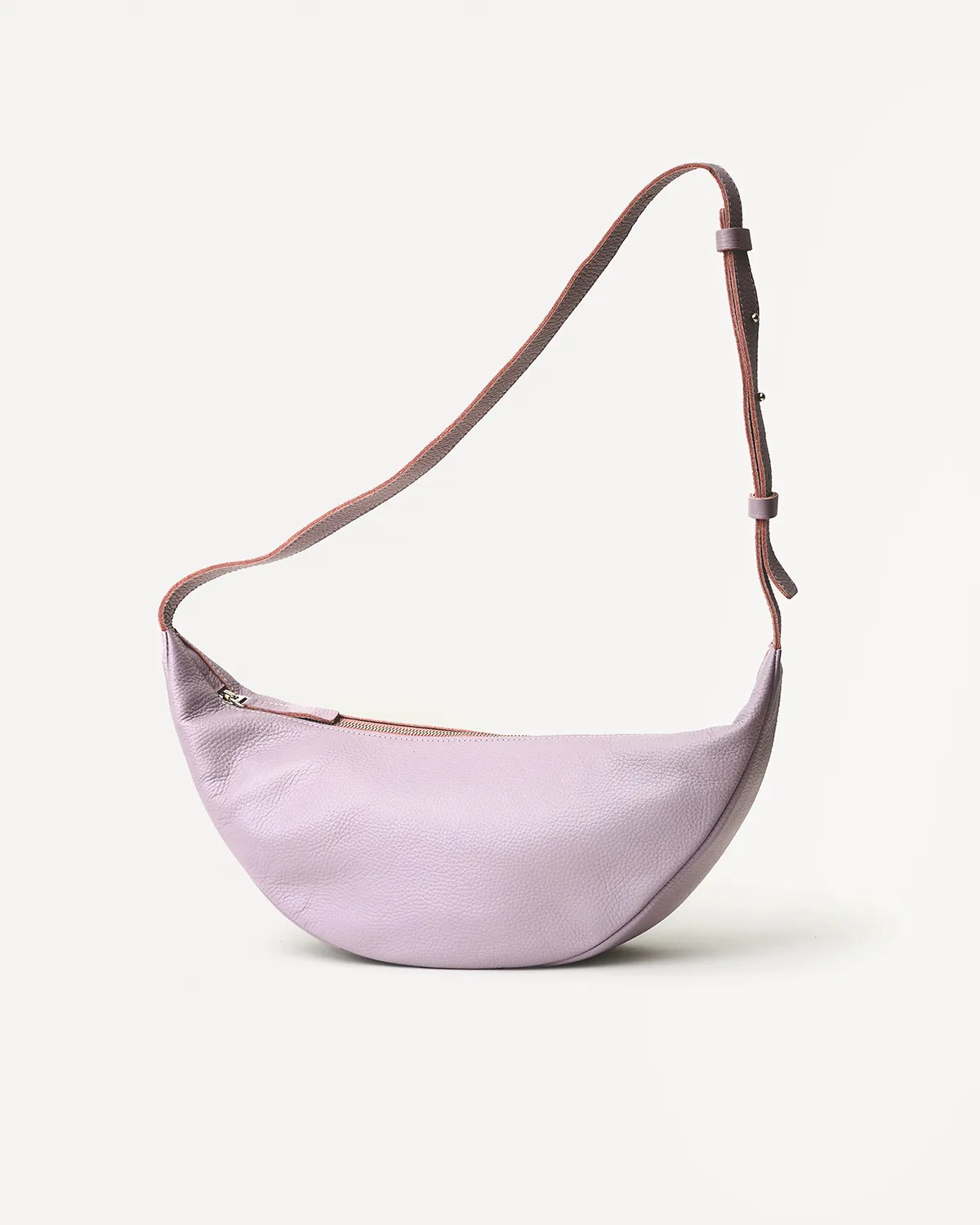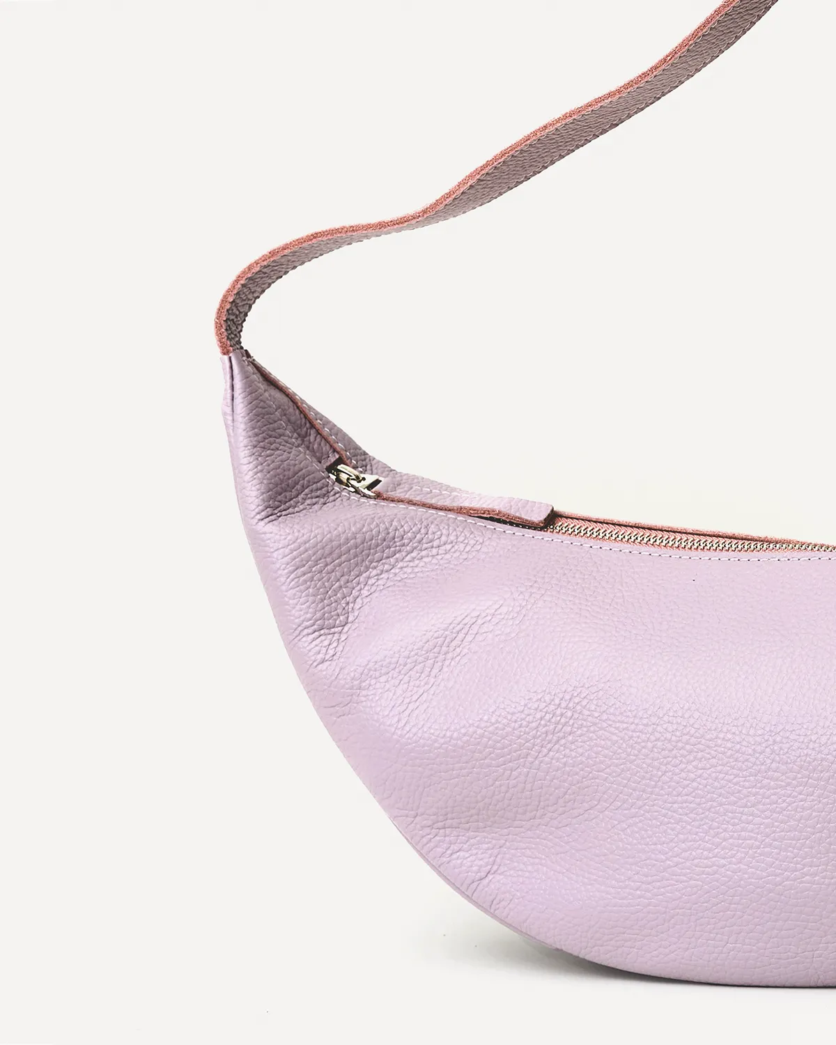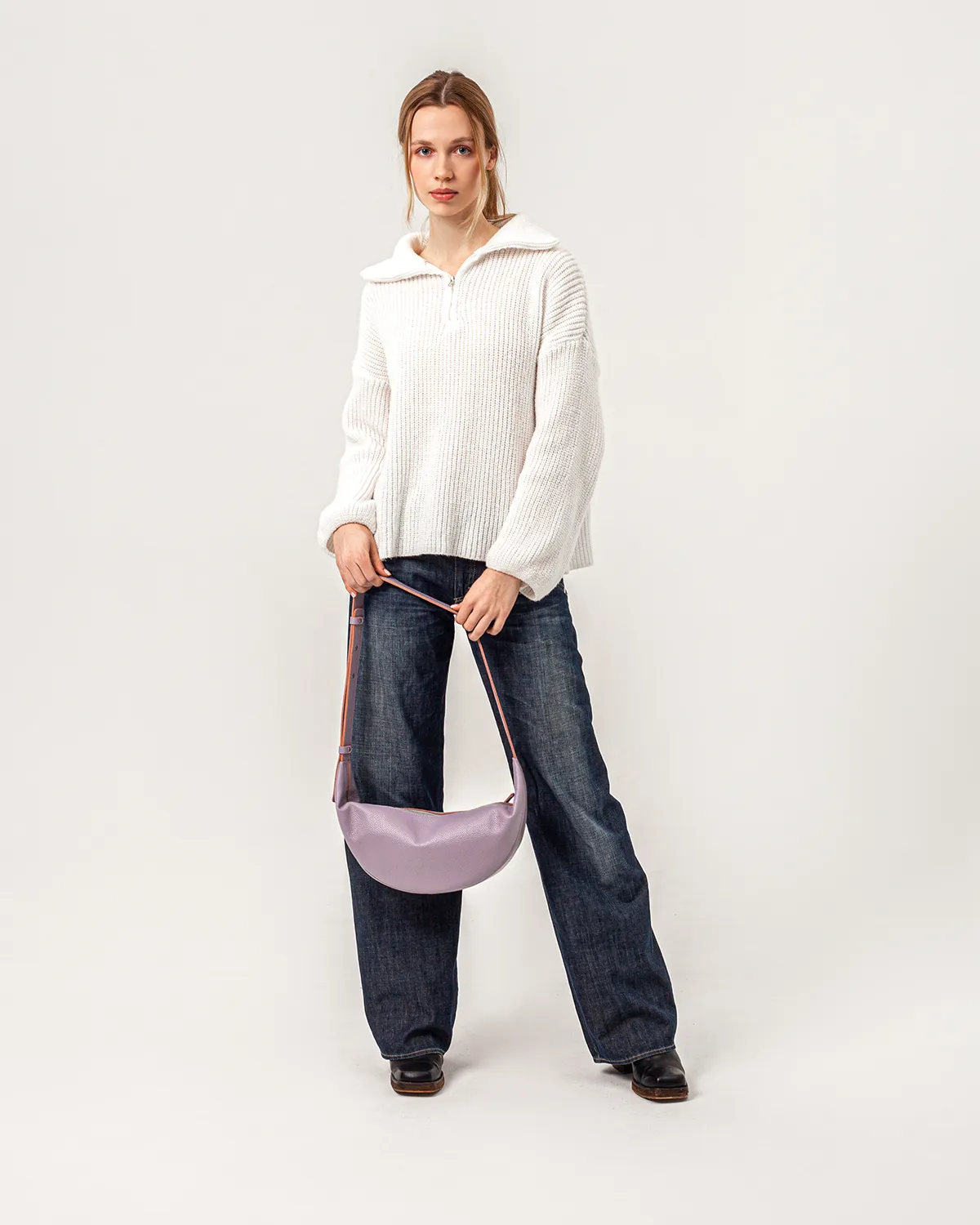 Сумка-хобо или сумка-мешок в форме полумесяца. Мягкая, комфортная и вместительная. Можно носить на плече, кросс-боди или просто в руках — длина ремня регулируется. Внутри подкладка и боковой кармашек на молнии.