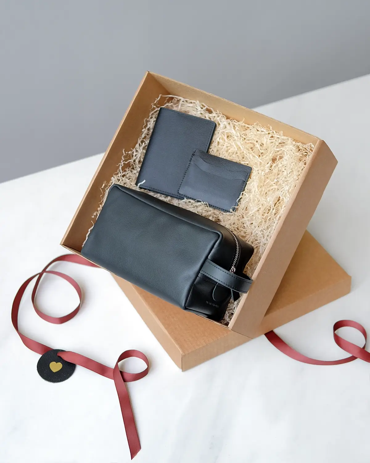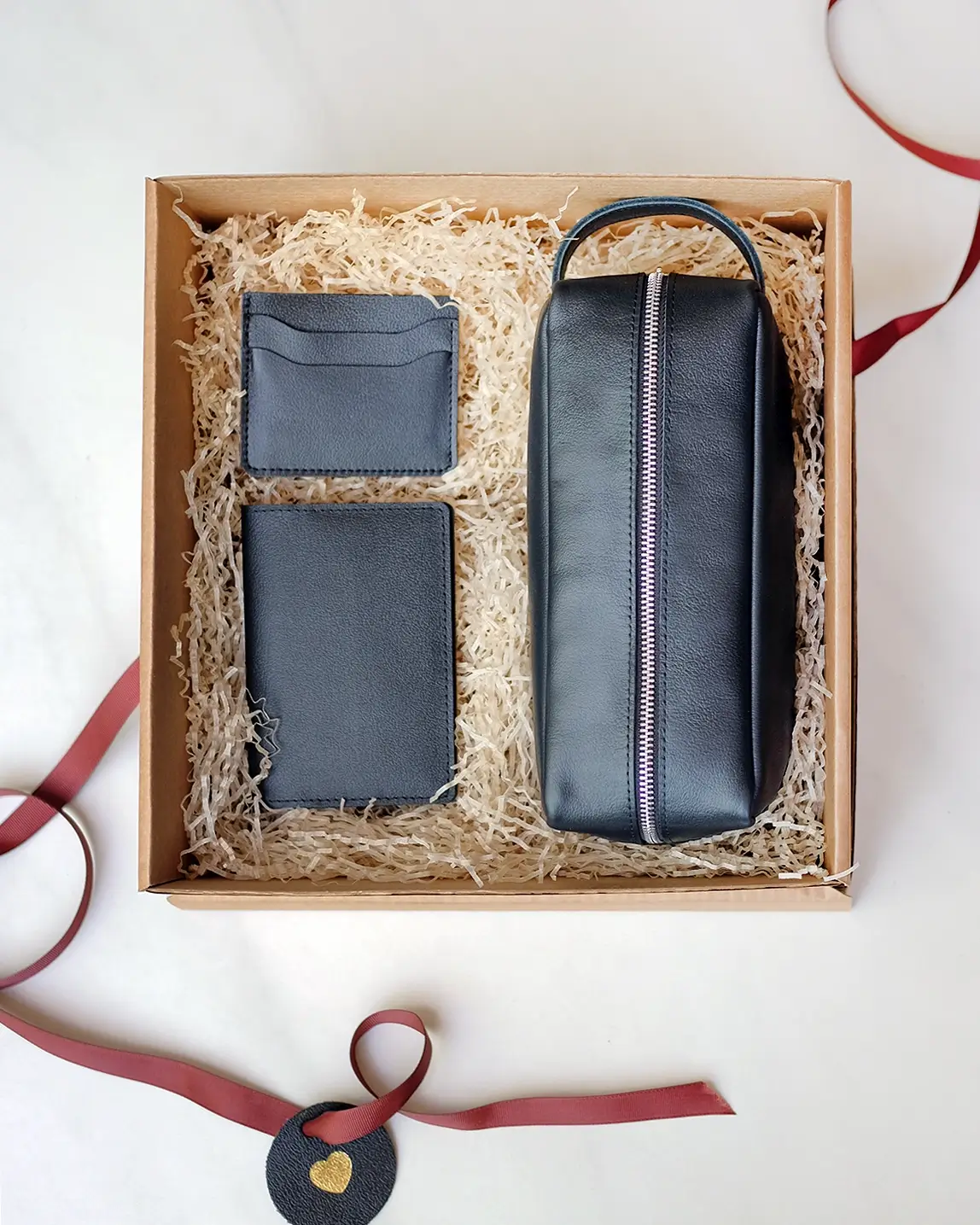 Набор аксессуаров из эластичной натуральной кожи с естественной гладкой поверхностью. Упакован в картонную коробочку с бумажным наполнителем, перевязывается лентой.