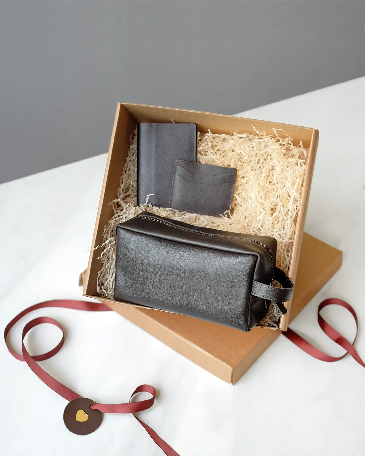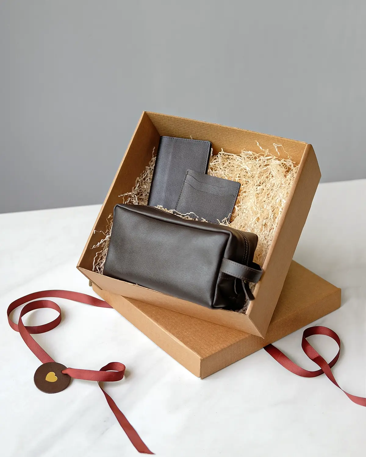 Набор аксессуаров из эластичной натуральной кожи с естественной гладкой поверхностью. Упакован в картонную коробочку с бумажным наполнителем, перевязывается лентой.