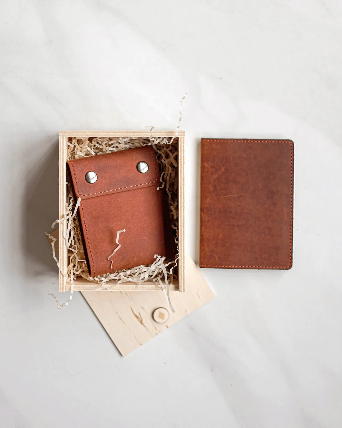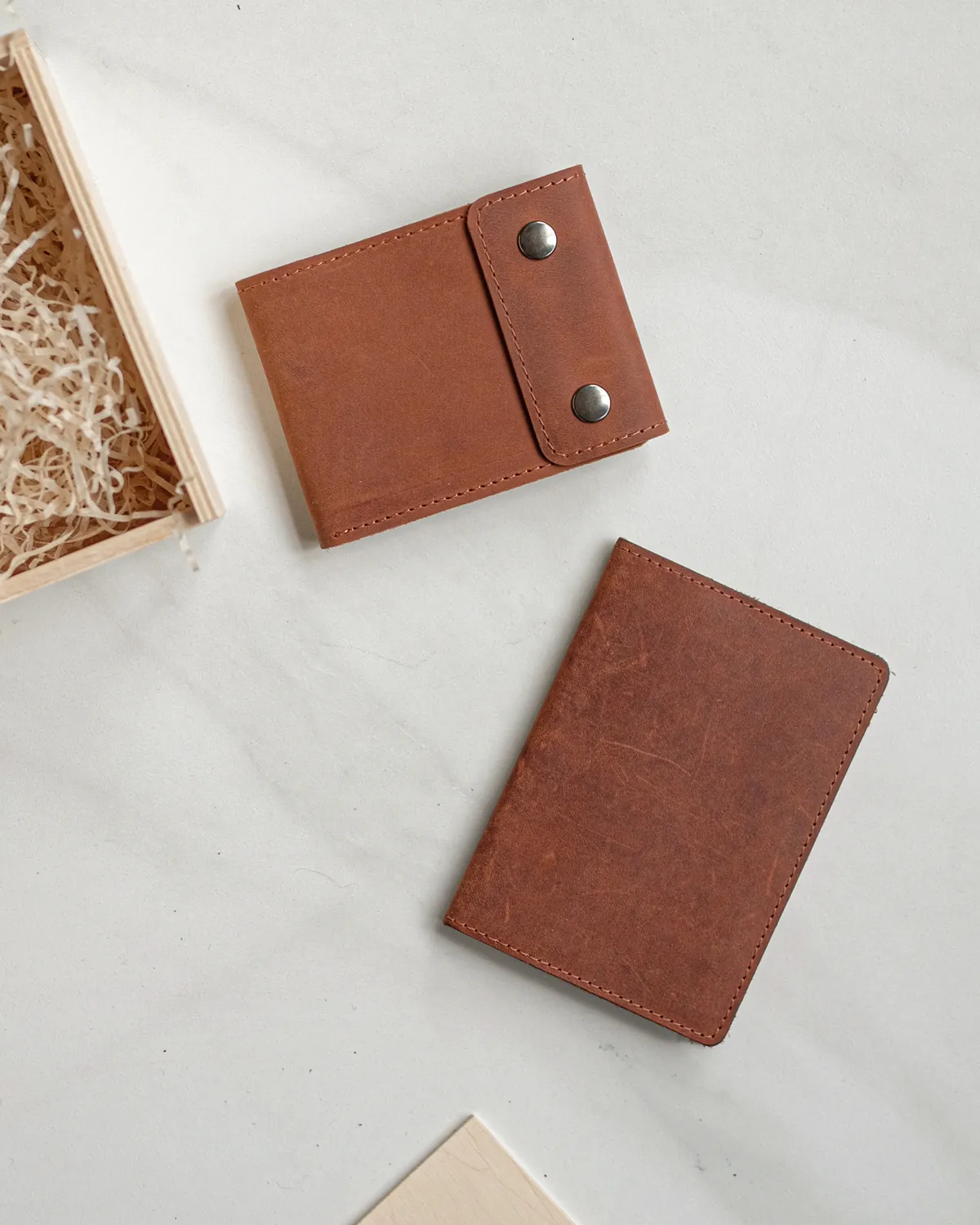 Подарочный набор кожаных аксессуаров из натуральной кожи, упакован в деревянную коробку. Кожа Bourbon с естественной бархатистой поверхностью, матовая, с мраморным рисунком и плавными цветовыми переходами. Со временем будет приобретать следы использования, в местах сгибов кожа становится светлее и красиво меняется со временем.