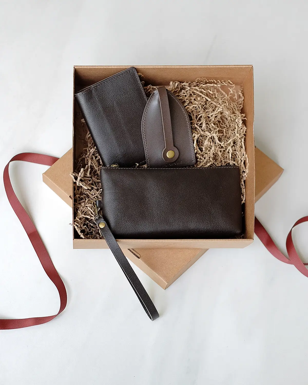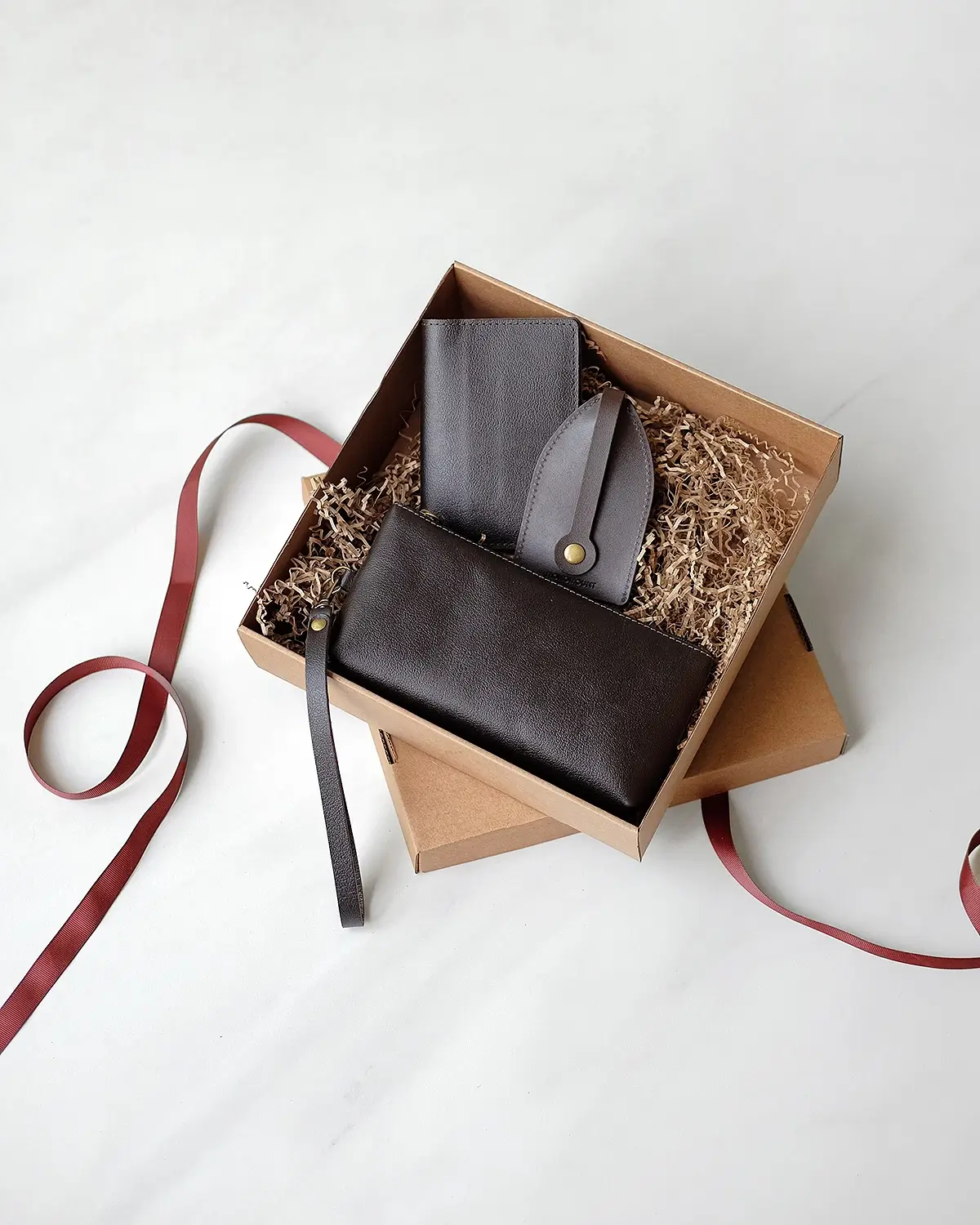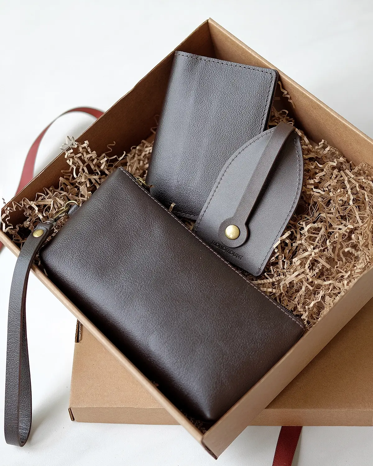 Подарочный набор кожаных аксессуаров в коричневом цвете в коробочке из плотного картона: несессер, обложка на паспорт и ключница.