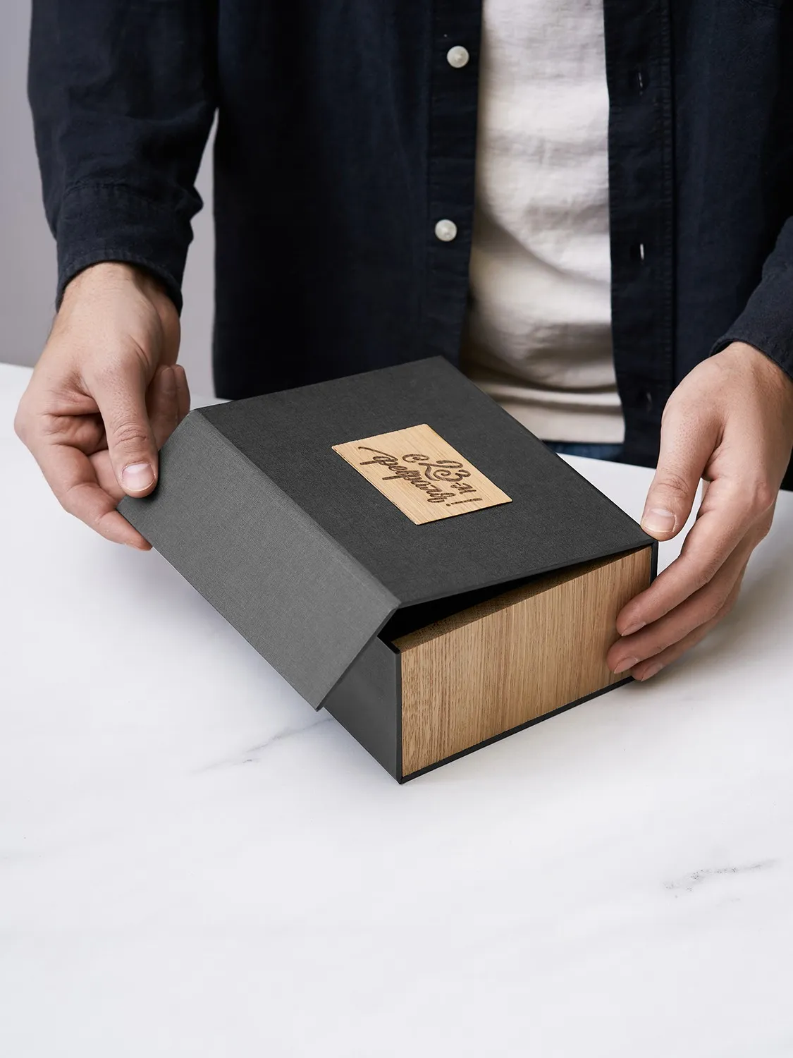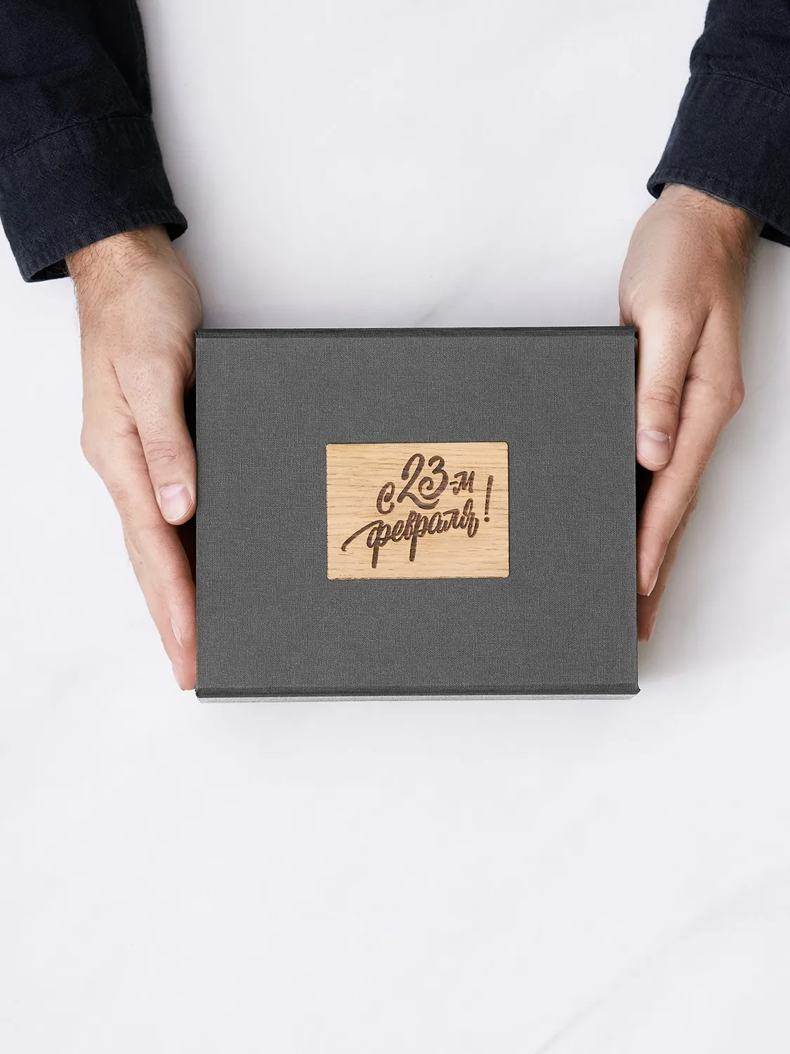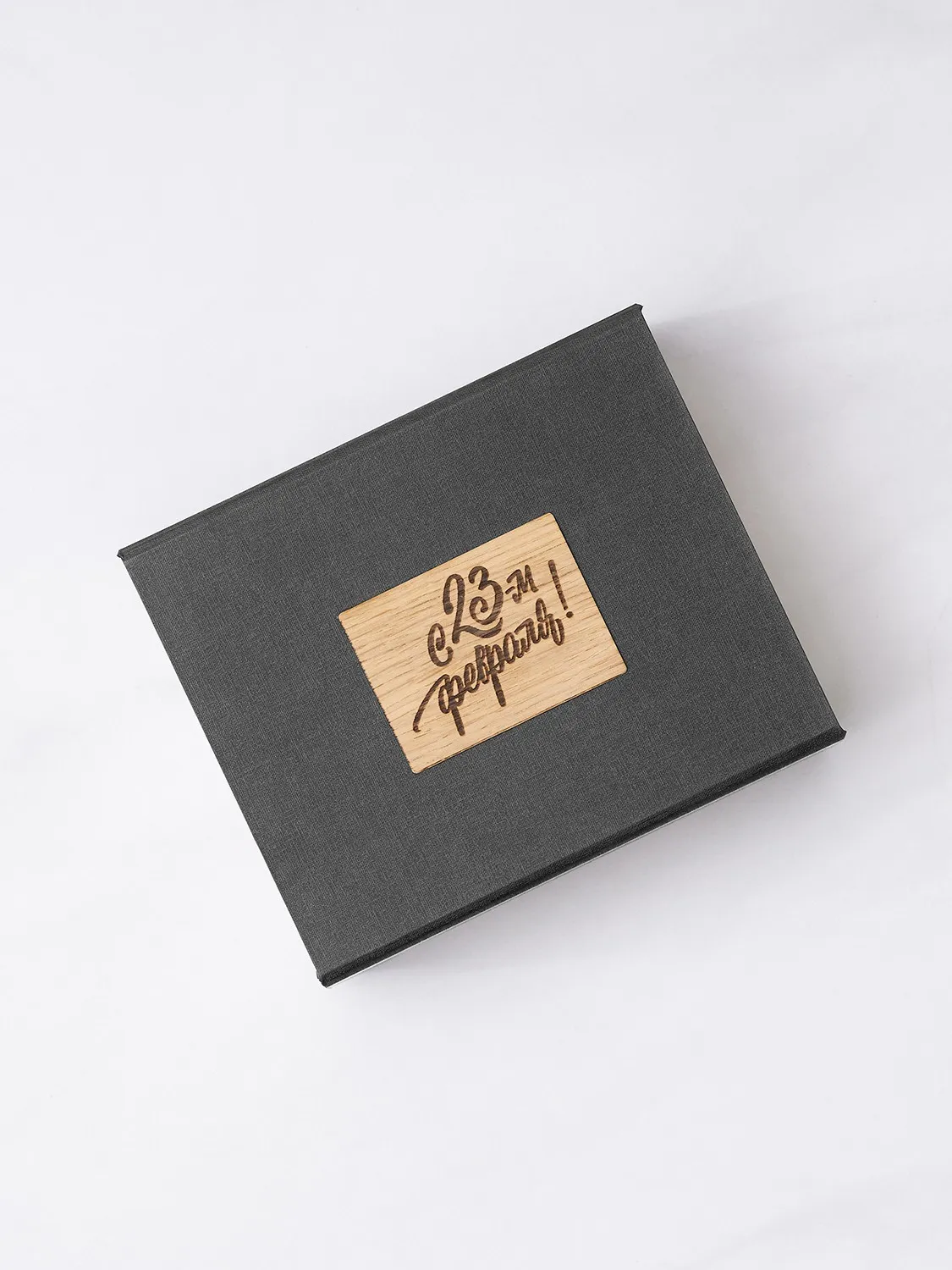 Коробка из кашированного плотного картона серого цвета, боковые ставки из цельного массива. Крышку коробки можно дополнить накладкой из дубового шпона с вашей гравировкой, или оставить без нанесения.